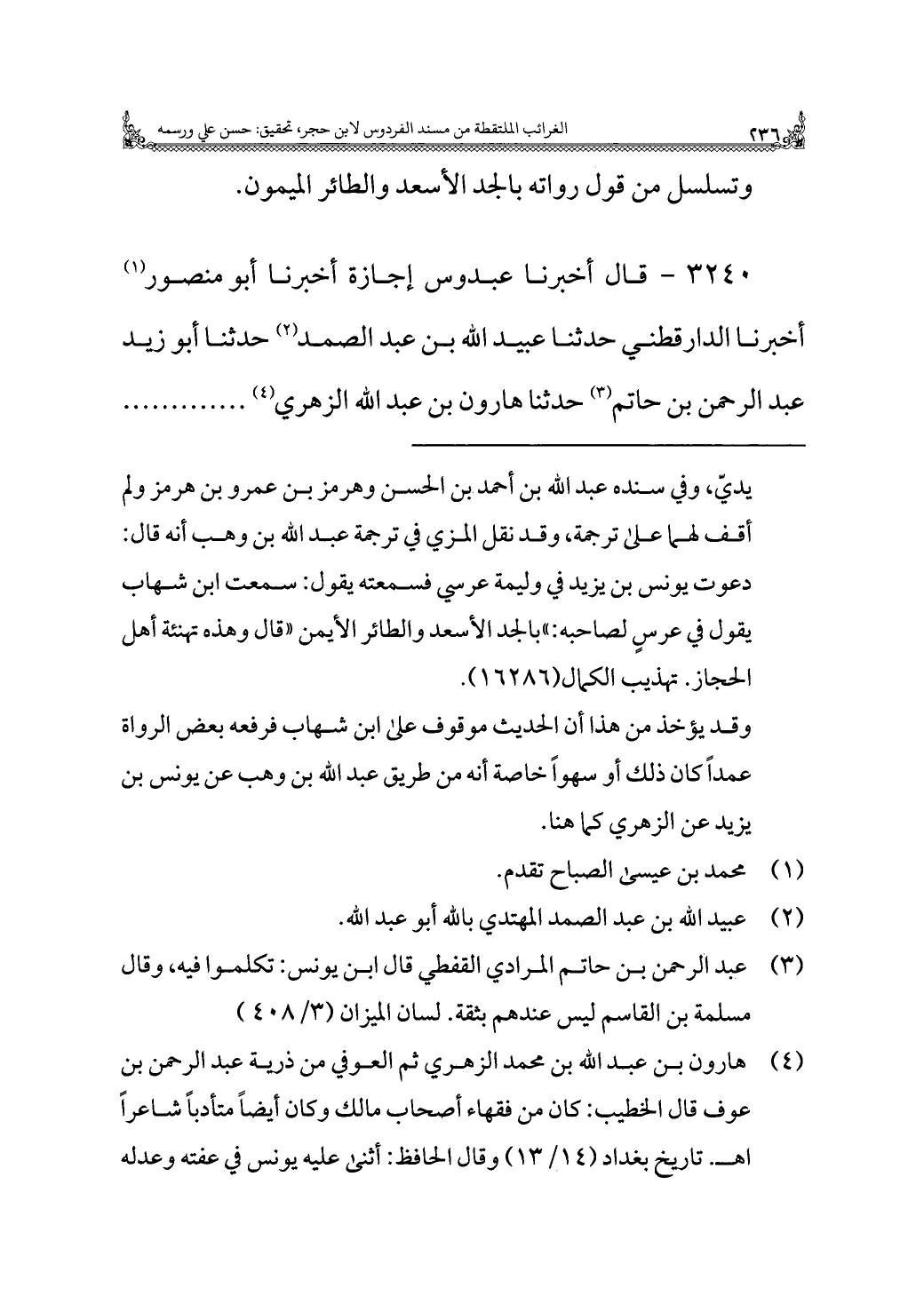 ٣٢٤٠ - قال أخبرنا عبدوس إجازة أخبرنا أبو منصور (¬١) أخبرنا الدارقطني حدثنا عبيد اللَّه بن عبد الصمد (¬٢) حدثنا أبو زيد عبد الرحمن بن حاتم (¬٣) حدثنا هارون بن عبد اللَّه الزهري (¬٤). . . . . .