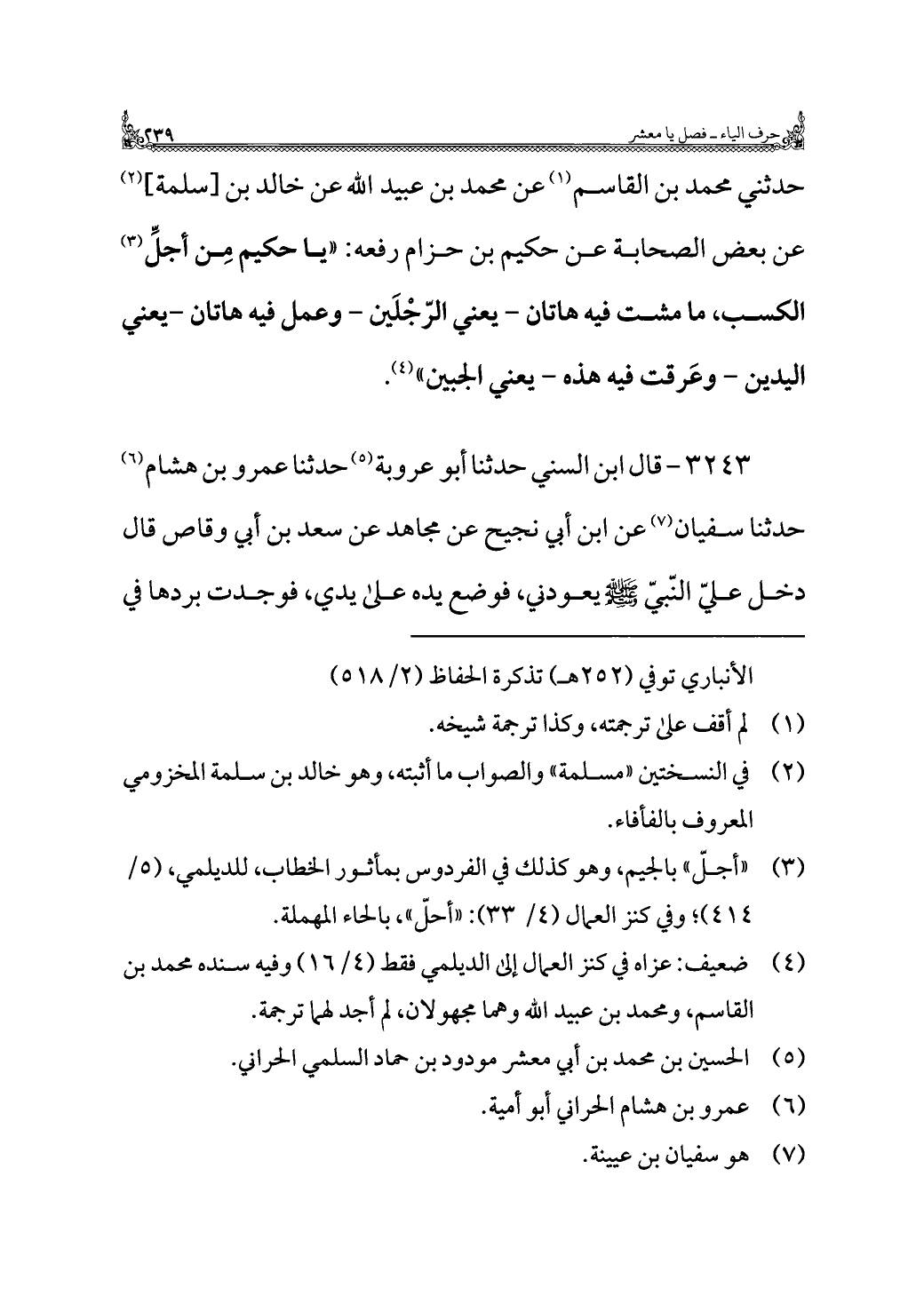 ٣٢٤٣ - قال ابن السني حدثنا أبو عروبة (¬٥) حدثنا عمرو بن هشام (¬٦) حدثنا سفيان (¬٧) عن ابن أبي نجيح عن مجاهد عن سعد بن أبي وقاص قال دخل عليّ النّبيّ -صلى اللَّه عليه وسلم- يعودني، فوضع يده على يدي، فوجدت بردها في