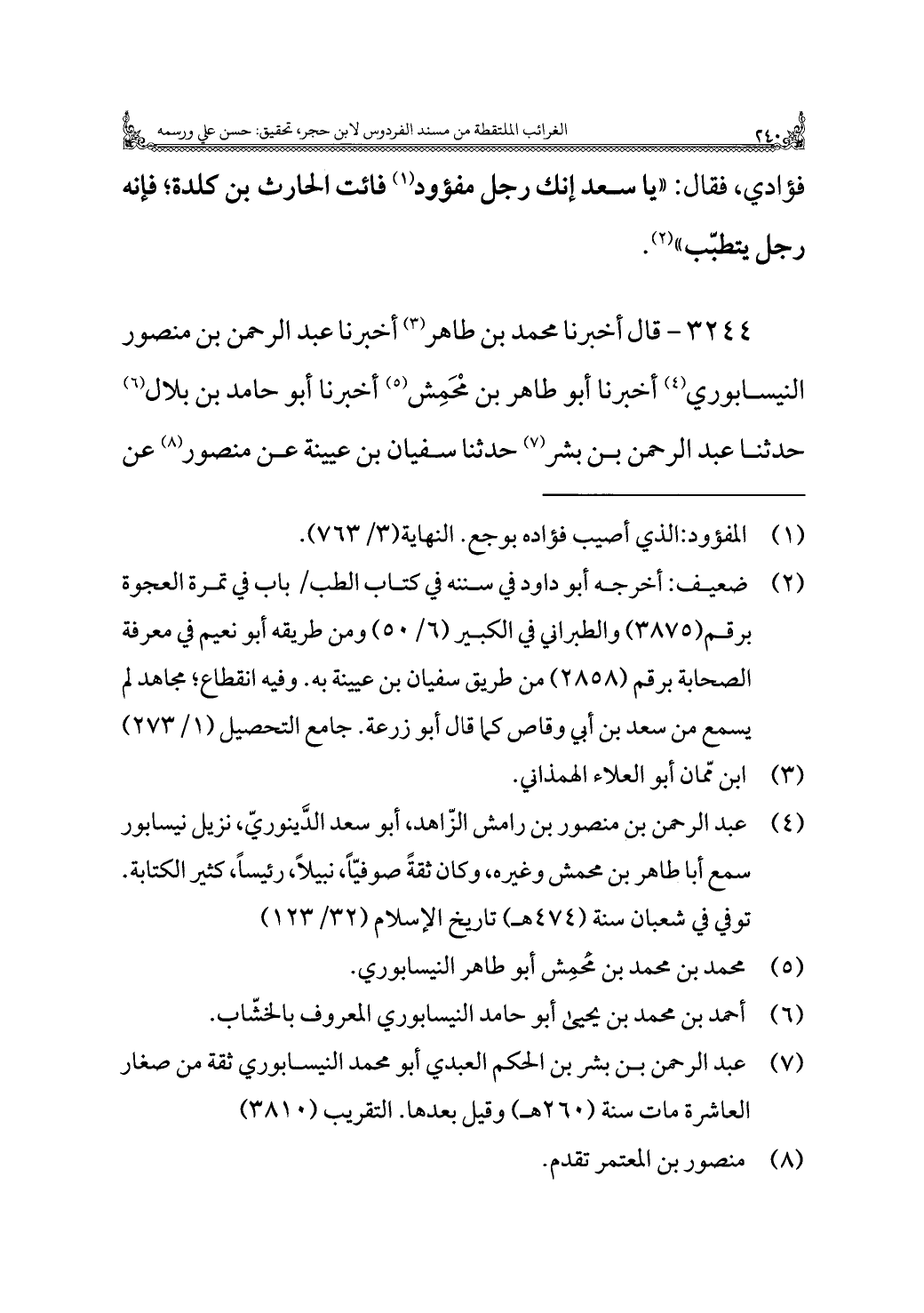 ٣٢٤٤ - قال أخبرنا محمد بن طاهر (¬٣) أخبرنا عبد الرحمن بن منصور النيسابوري (¬٤) أخبرنا أبو طاهر بن مَحْمِش (¬٥) أخبرنا أبو حامد بن بلال (¬٦) حدثنا عبد الرحمن بن بشر (¬٧) حدثنا سفيان بن عيينة عن منصور (¬٨) عن