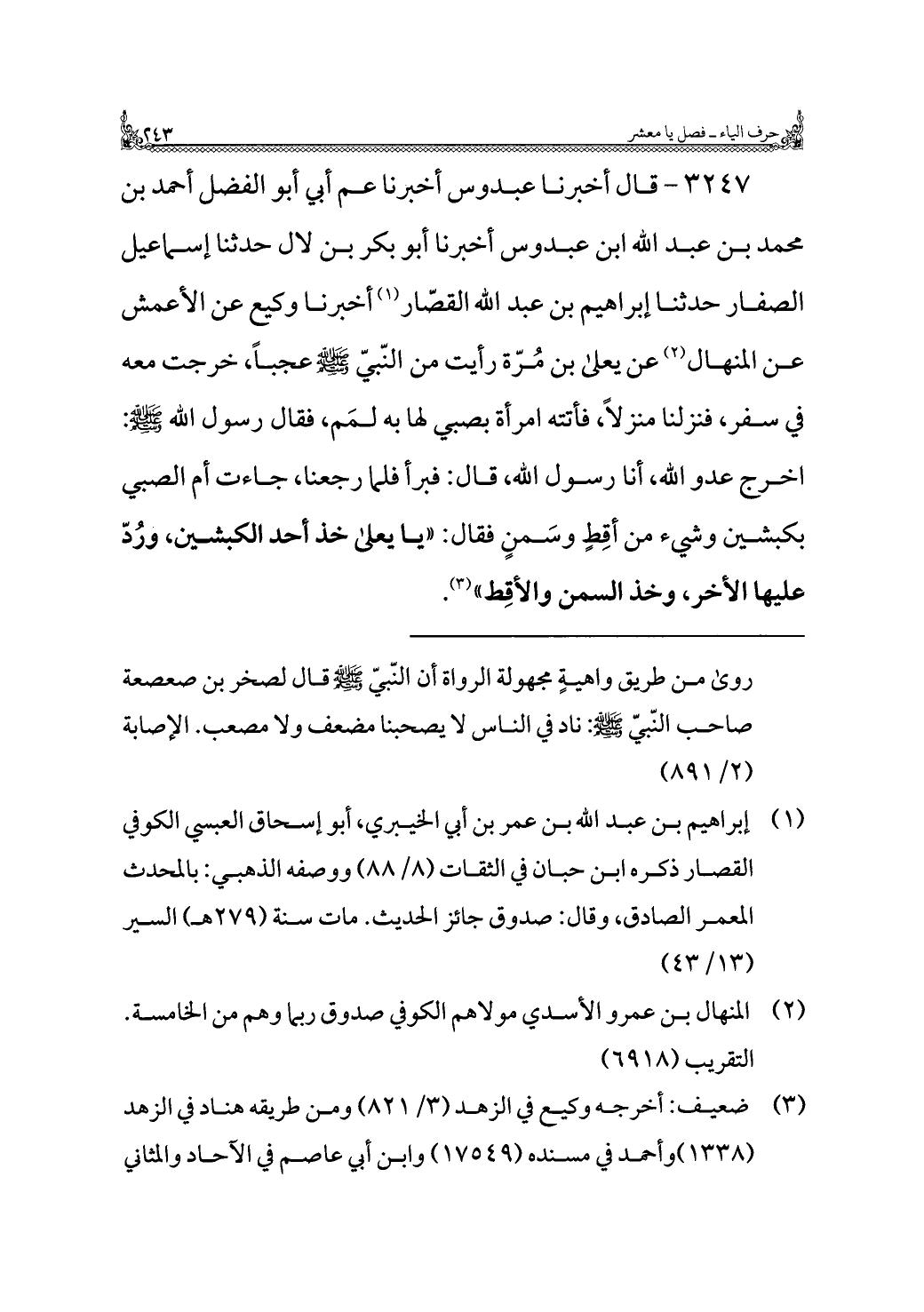 ٣٢٤٧ - قال أخبرنا عبدوس أخبرنا عم أبي أبو الفضل أحمد بن محمد بن عبد اللَّه ابن عبدوس أخبرنا أبو بكر بن لال حدثنا إسماعيل الصفار حدثنا إبراهيم بن عبد اللَّه القصّار (¬١) أخبرنا وكيع عن الأعمش عن المنهال (¬٢) عن يعلى بن مُرّة رأيت من النّبيّ -صلى اللَّه عليه وسلم- عجبًا، خرجت معه في سفر، فنزلنا منزلًا، فأتته امرأة بصبي لها به لمَم، فقال رسول اللَّه -صلى اللَّه عليه وسلم-: اخرج عدو اللَّه، أنا رسول اللَّه، قال: فبرأ فلما رجعنا، جاءت أم الصبي بكبشين وشيء من أقِطٍ وسَمنٍ فقال: "يا يعلى خذ أحد الكبشين، ورُدّ عليها الأخر، وخذ السمن والأقِط" (¬٣).