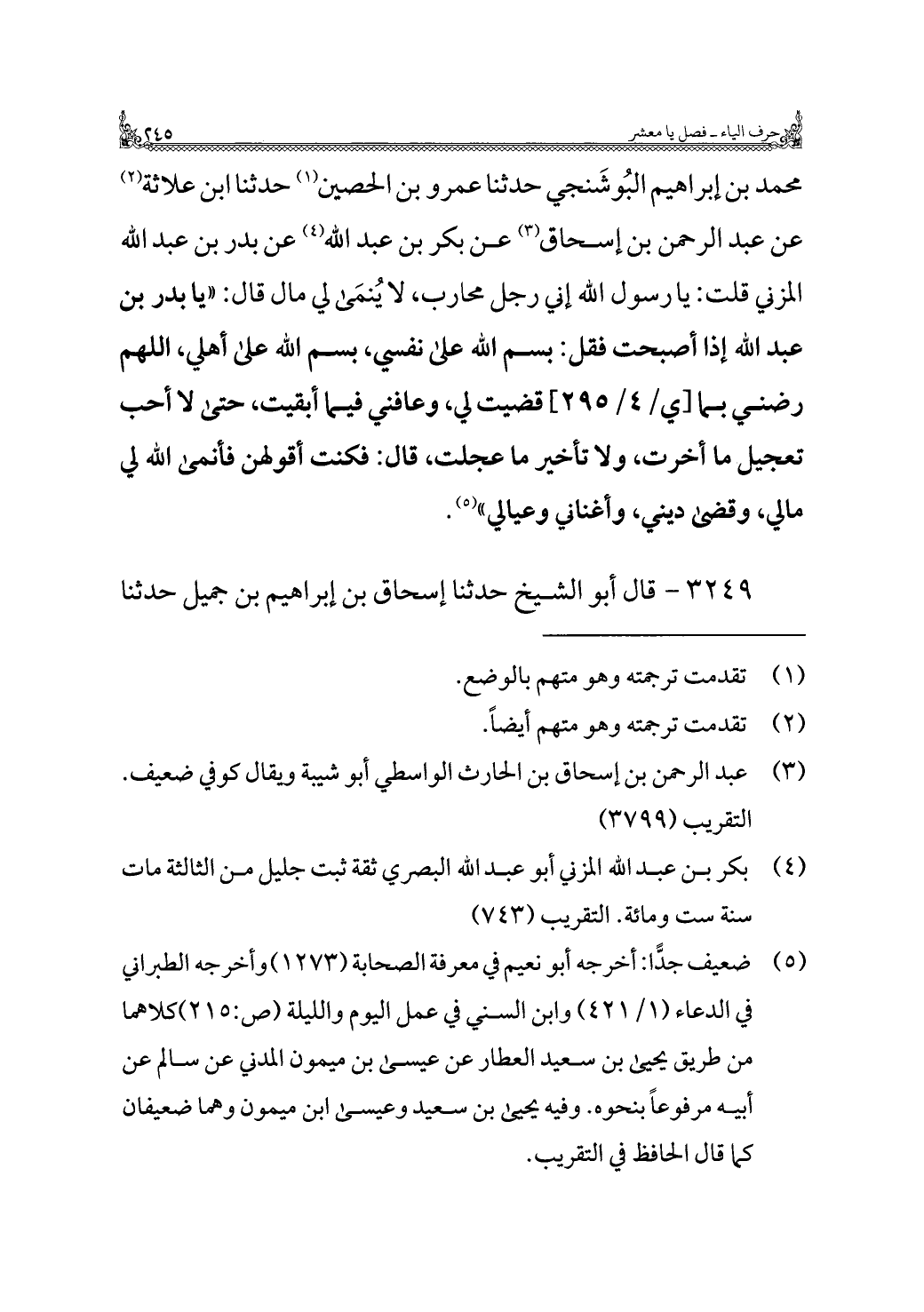 محمد بن إبراهيم البُوشَنجي حدثنا عمرو بن الحصين (¬١) حدثنا ابن علاثة (¬٢) عن عبد الرحمن بن إسحاق (¬٣) عن بكر بن عبد اللَّه (¬٤) عن بدر بن عبد اللَّه المزني قلت: يا رسول اللَّه إني رجل محارب، لا يُنمَى لي مال قال: "يا بدر بن عبد اللَّه إذا أصبحت فقل: بسم اللَّه على نفسي، بسم اللَّه على أهلي، اللهم رضني بما قضيت لي، وعافني فيما أبقيت، حتى لا أحب تعجيل ما أخرت، ولا تأخير ما عجلت، قال: فكنت أقولهن فأنمى اللَّه لي مالي، وقضى ديني، وأغناني وعيالي" (¬٥).