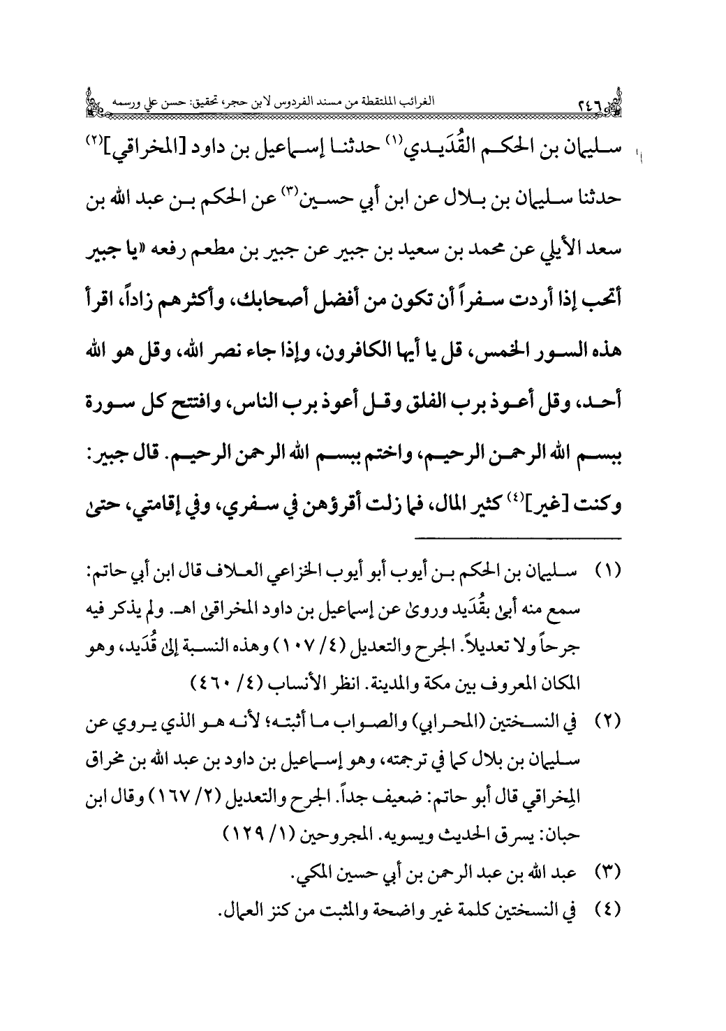 سليمان بن الحكم القُدَيدي (¬١) حدثنا إسماعيل بن داود [المخراقي] (¬٢) حدثنا سليمان بن بلال عن ابن أبي حسين (¬٣) عن الحكم بن عبد اللَّه بن سعد الأيلي عن محمد بن سعيد بن جبير عن جبير بن مطعم رفعه "يا جبير أتحب إذا أردت سفرًا أن تكون من أفضل أصحابك، وأكثرهم زادًا، اقرأ هذه السور الخمس، قل يا أيها الكافرون، وإذا جاء نصر اللَّه، وقل هو اللَّه أحد، وقل أعوذ برب الفلق وقل أعوذ برب الناس، وافتتح كل سورة ببسم اللَّه الرحمن الرحيم، واختم ببسم اللَّه الرحمن الرحيم. قال جبير: وكنت [غير] (¬٤) كثير المال، فما زلت أقرؤهن في سفري، وفي إقامتي، حتى