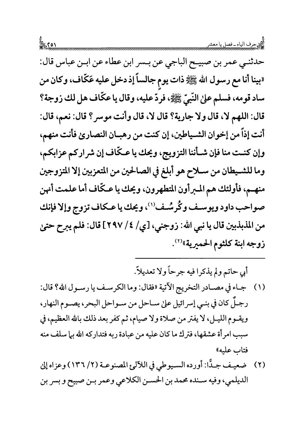 حدثني عمر بن صبيح الباجي عن بسر ابن عطاء عن ابن عباس قال: "بينا أنا مع رسول اللَّه -صلى اللَّه عليه وسلم- ذات يومٍ جالسًا إذ دخل عليه عَكّاف، وكان من ساد قومه، فسلم على النبيّ -صلى اللَّه عليه وسلم-، فردّ عليه، وقال يا عكّاف هل لك زوجة؟ قال: اللهم لا، قال ولا جارية؟ قال لا، قال وأنت موسر؟ قال: نعم، قال: أنت إذًا من إخوان الشياطين، إن كنت من رهبان النصارى فأنت منهم، وإن كنت منا فإن شأننا التزويج، ويحك يا عكّاف إن شراركم عزابكم، وما للشيطان من سلاح هو أبلغ في الصالحين من المتعزبين إلا المتزوجين منهم، فأولئك هم المبرأون المتطهرون، ويحك يا عكّاف أما علمت أنهن صواحب داود ويوسف وكُرسُف (¬١)، ويحك يا عكاف تزوج وإلا فإنك من المذبذبين قال يا نبي اللَّه: زوجني، قال: فلم يبرح حتى زوجه ابنة كلثوم الحميرية" (¬٢).