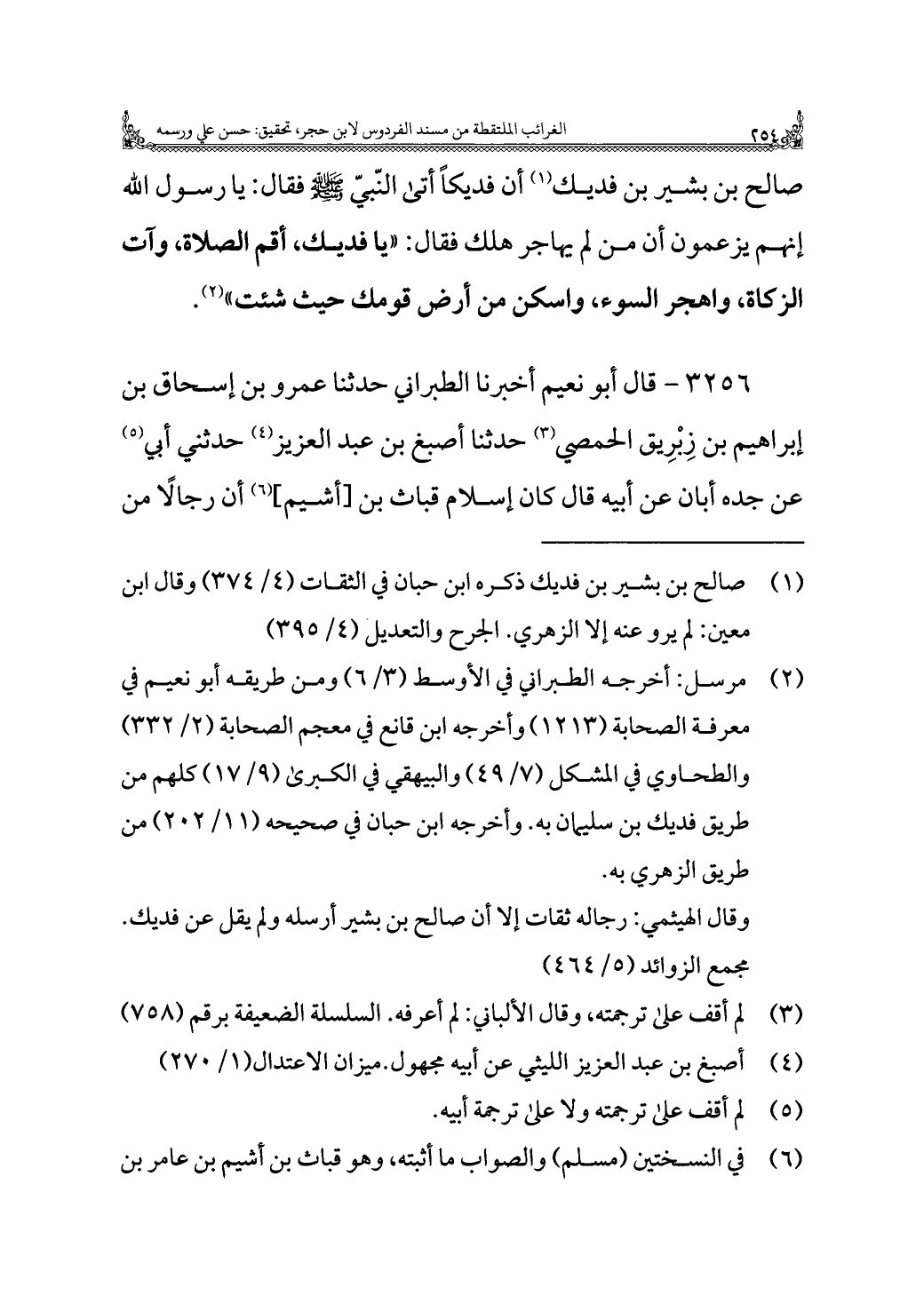صالح بن بشير بن فديك (¬١) أن فديكًا أتى النّبيّ -صلى اللَّه عليه وسلم- فقال: يا رسول اللَّه إنهم يزعمون أن من لم يهاجر هلك فقال: "يا فديك، أقم الصلاة، وآت الزكاة، واهجر السوء، واسكن من أرض قومك حيث شئت" (¬٢).