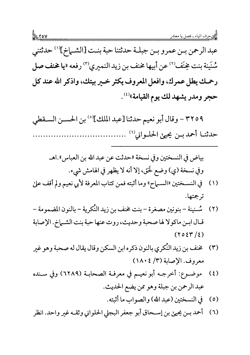 عبد الرحمن بن عمرو بن جبلة حدثتنا حبة بنت [الشماخ] (¬١) حدثتني سُنَينة بنت مِخنَف (¬٢) عن أبيها مخنف بن زيد النميري (¬٣) رفعه "يا مخنف صل رحمك يطل عمرك، وافعل المعروف يكثر خير بيتك، واذكر اللَّه عند كل حجر ومدر يشهد لك يوم القيامة" (¬٤).