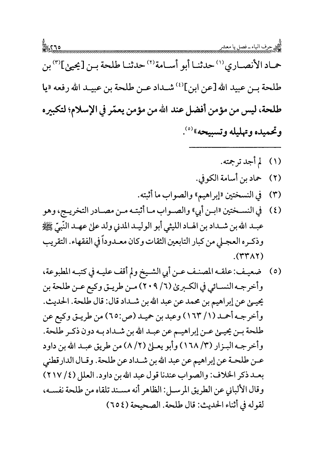 حماد الأنصاري (¬١) حدثنا أبو أسامة (¬٢) حدثنا طلحة بن [يحيى] (¬٣) بن طلحة بن عبيد اللَّه [عن ابن] (¬٤) شداد عن طلحة بن عبيد اللَّه رفعه "يا طلحة، ليس من مؤمن أفضل عند اللَّه من مؤمن يعمّر في الإسلام؛ لتكبيره وتحميده وتهليله وتسبيحه" (¬٥).