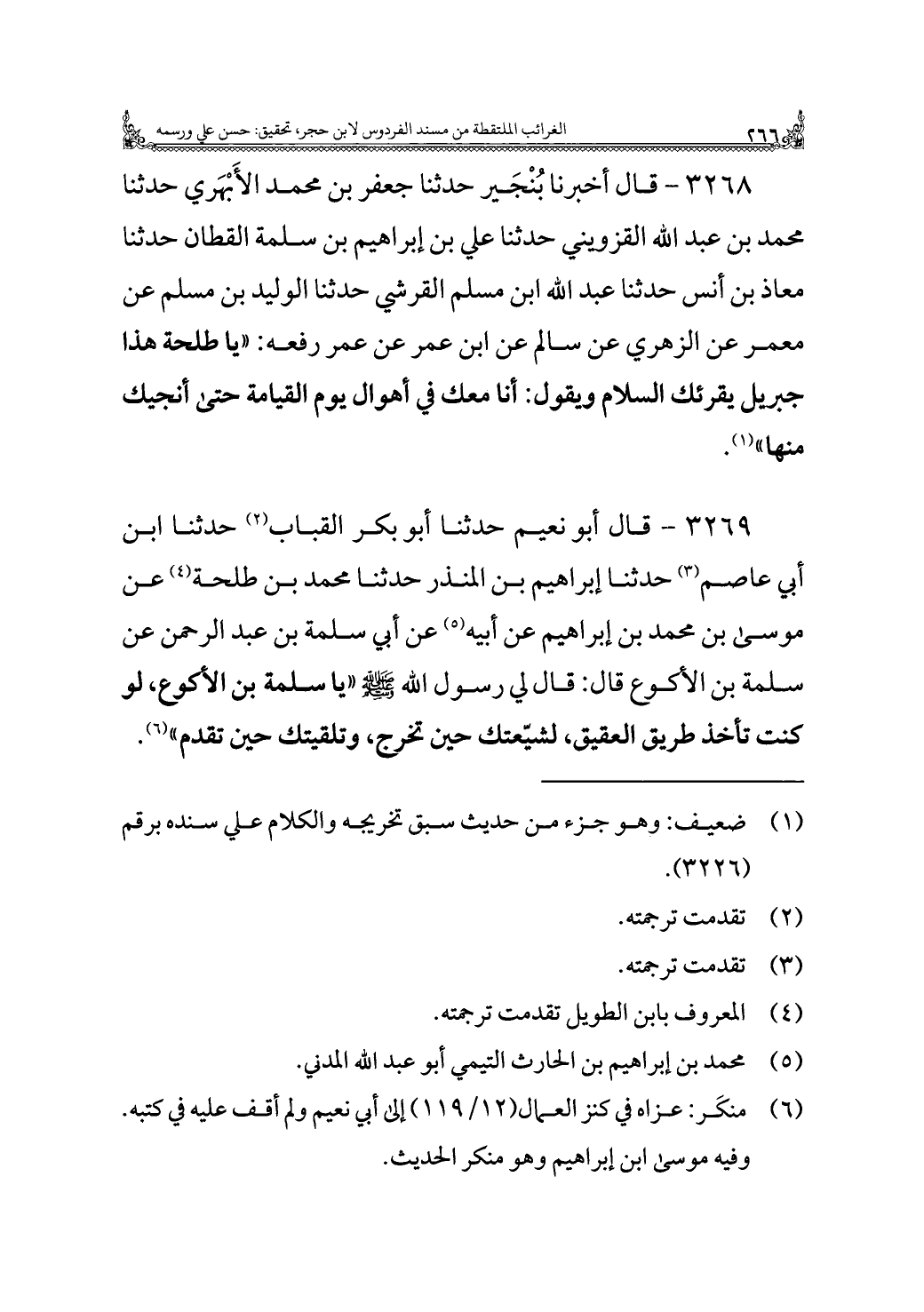 ٣٢٦٨ - قال أخبرنا بُنْجَير حدثنا جعفر بن محمد الأَبْهَري حدثنا محمد بن عبد اللَّه القزويني حدثنا علي بن إبراهيم بن سلمة القطان حدثنا معاذ بن أنس حدثنا عبد اللَّه ابن مسلم القرشي حدثنا الوليد بن مسلم عن معمر عن الزهري عن سالم عن ابن عمر عن عمر رفعه: "يا طلحة هذا جبريل يقرئك السلام ويقول: أنا معك في أهوال يوم القيامة حتى أنجيك منها" (¬١).