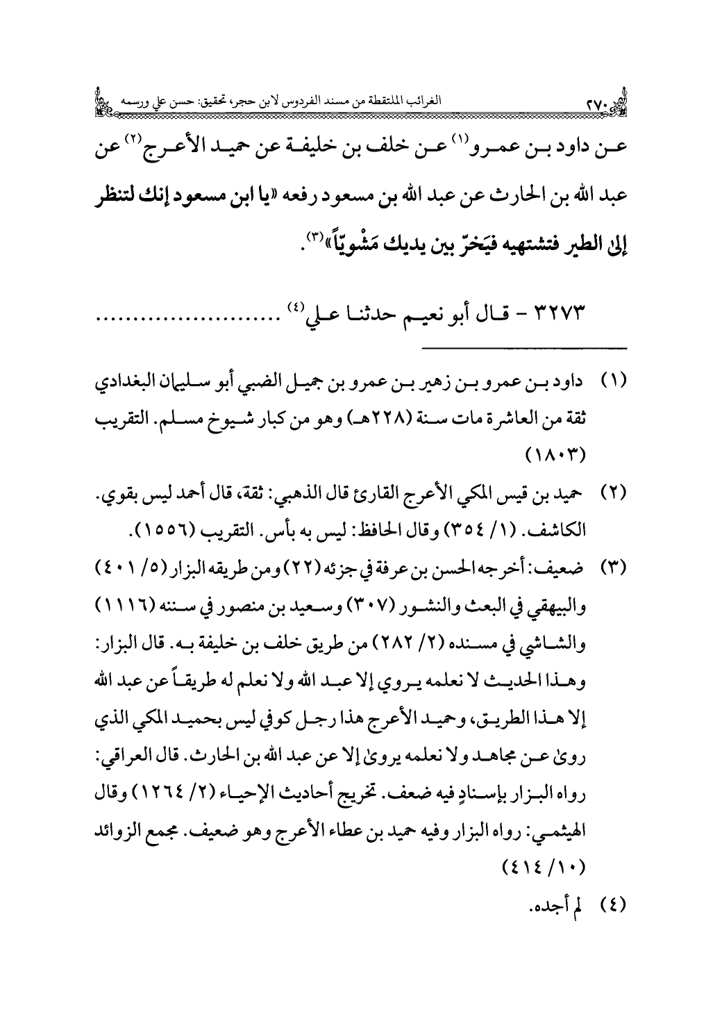 عن داود بن عمرو (¬١) عن خلف بن خليفة عن حميد الأعرج (¬٢) عن عبد اللَّه بن الحارث عن عبد اللَّه بن مسعود رفعه "يا ابن مسعود إنك لتنظر إلى الطير فتشتهيه فيَخرّ بين يديك مَشْويًّا" (¬٣).