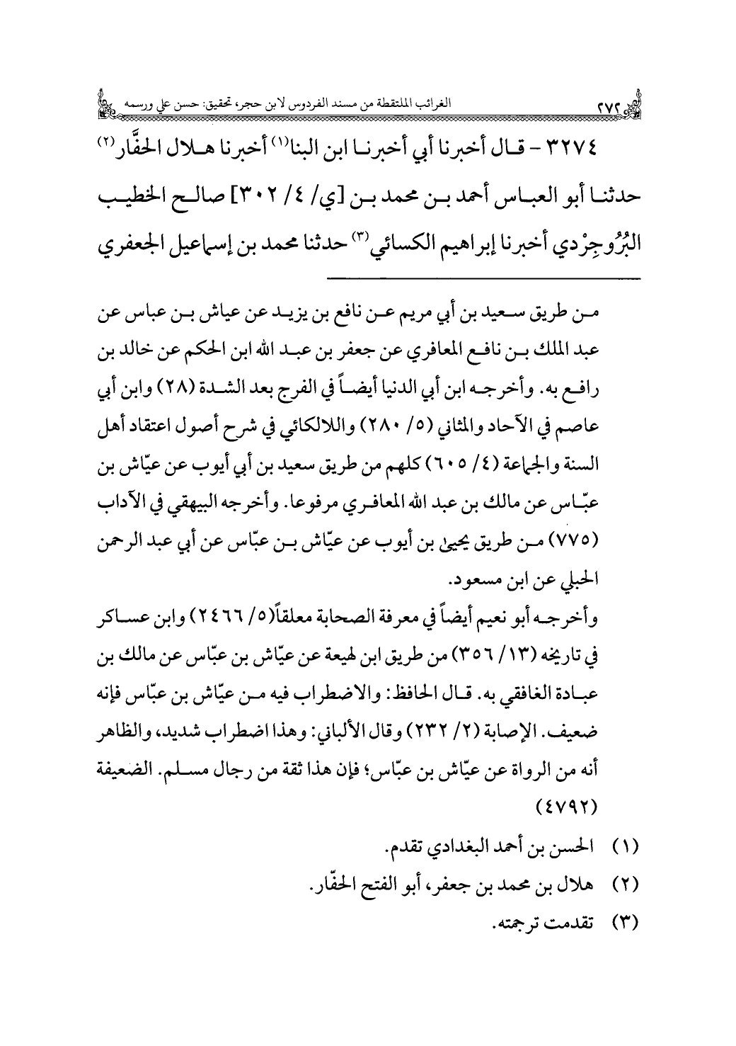 ٣٢٧٤ - قال أخبرنا أبي أخبرنا ابن البنا (¬١) أخبرنا هلال الحفَّار (¬٢) حدثنا أبو العباس أحمد بن محمد بن صالح الخطيب البُرُوجِرْدي أخبرنا إبراهيم الكسائي (¬٣) حدثنا محمد بن إسماعيل الجعفري