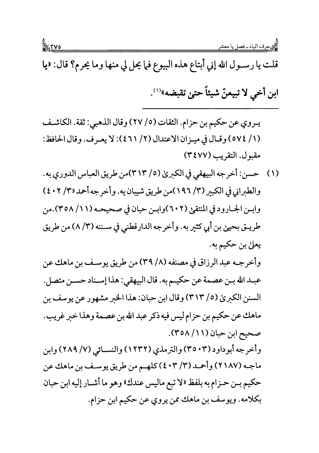 وأخرجه عبد الرزاق في مصنفه (٨/ ٣٩) من طريق يوسف بن ماهك عن عبد اللَّه بن عصمة عن حكيم به. قال البيهقي: هذا إسناد حسن متصل. السنن الكبرى (٥/ ٣١٣) وقال ابن حبان: هذا الخبر مشهور عن يوسف بن ماهك عن حكيم بن حزام ليس فيه ذكر عبد اللَّه بن عصمة وهذا خبر غريب. صحيح ابن حبان (١١/ ٣٥٨).