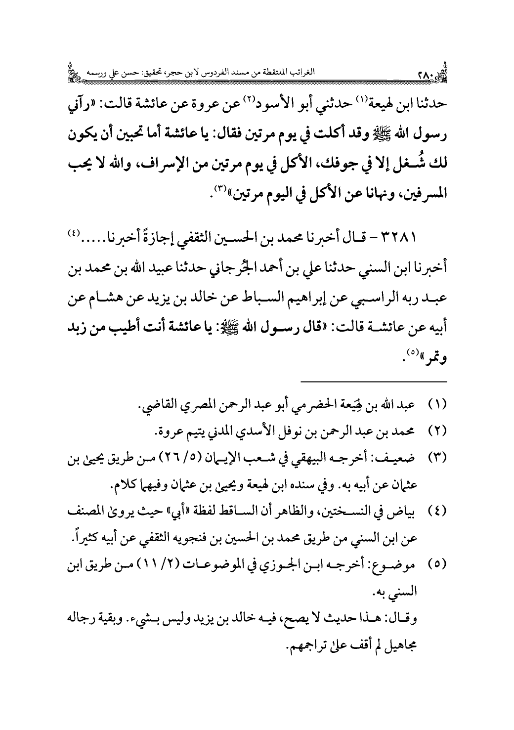 ٣٢٨١ - قال أخبرنا محمد بن الحسين الثقفي إجازةً أخبرنا. . . . (¬٤) أخبرنا ابن السني حدثنا علي بن أحمد الجُرجاني حدثنا عبيد اللَّه بن محمد بن عبد ربه الراسبي عن إبراهيم السباط عن خالد بن يزيد عن هشام عن أبيه عن عائشة قالت: "قال رسول اللَّه -صلى اللَّه عليه وسلم-: يا عائشة أنت أطيب من زبد وتمر" (¬٥).