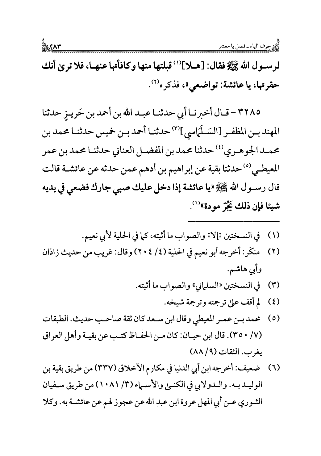 ٣٢٨٥ - قال أخبرنا أبي حدثنا عبد اللَّه بن أحمد بن حَريزٍ حدثنا المهند بن المظفر [السَلَمَاسي] (¬٣) حدثنا أحمد بن خميس حدثنا محمد بن محمد الجوهري (¬٤) حدثنا محمد بن المفضل العناني حدثنا محمد بن عمر المعيطي (¬٥) حدثنا بقية عن إبراهيم بن أدهم عمن حدثه عن عائشة قالت قال رسول اللَّه -صلى اللَّه عليه وسلم- "يا عائشة إذا دخل عليك صبي جارك فضعي في يديه شيئا فإن ذلك يَجُرّ مودة" (¬٦).