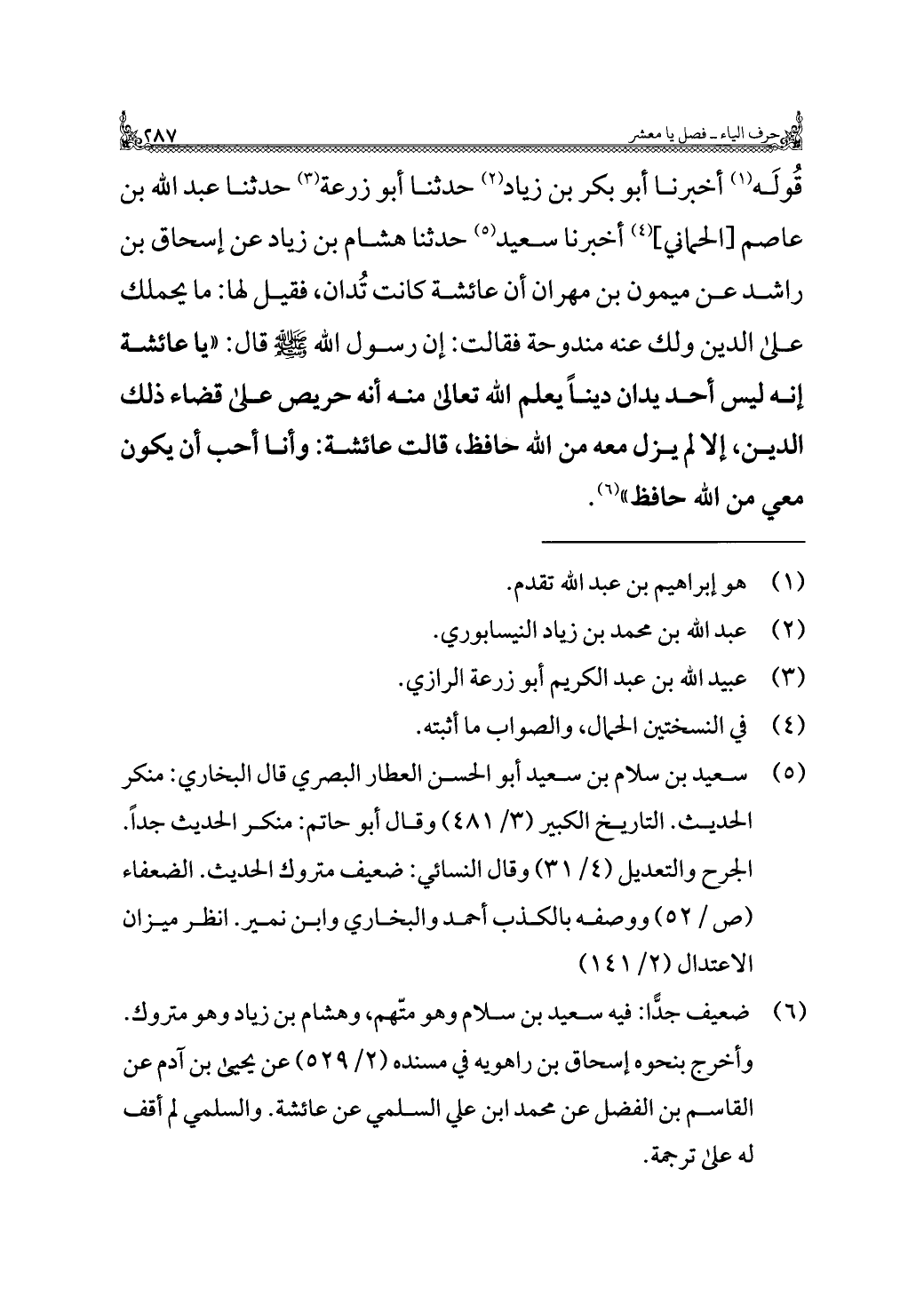 قُولَه (¬١) أخبرنا أبو بكر بن زياد (¬٢) حدثنا أبو زرعة (¬٣) حدثنا عبد اللَّه بن عاصم [الحماني] (¬٤) أخبرنا سعيد (¬٥) حدثنا هشام بن زياد عن إسحاق بن راشد عن ميمون بن مهران أن عائشة كانت تُدان، فقيل لها: ما يحملك على الدين ولك عنه مندوحة فقالت: إن رسول اللَّه -صلى اللَّه عليه وسلم- قال: "يا عائشة إنه ليس أحد يدان دينًا يعلم اللَّه تعالى منه أنه حريص على قضاء ذلك الدين، إلا لم يزل معه من اللَّه حافظ، قالت عائشة: وأنا أحب أن يكون معي من اللَّه حافظ" (¬٦).