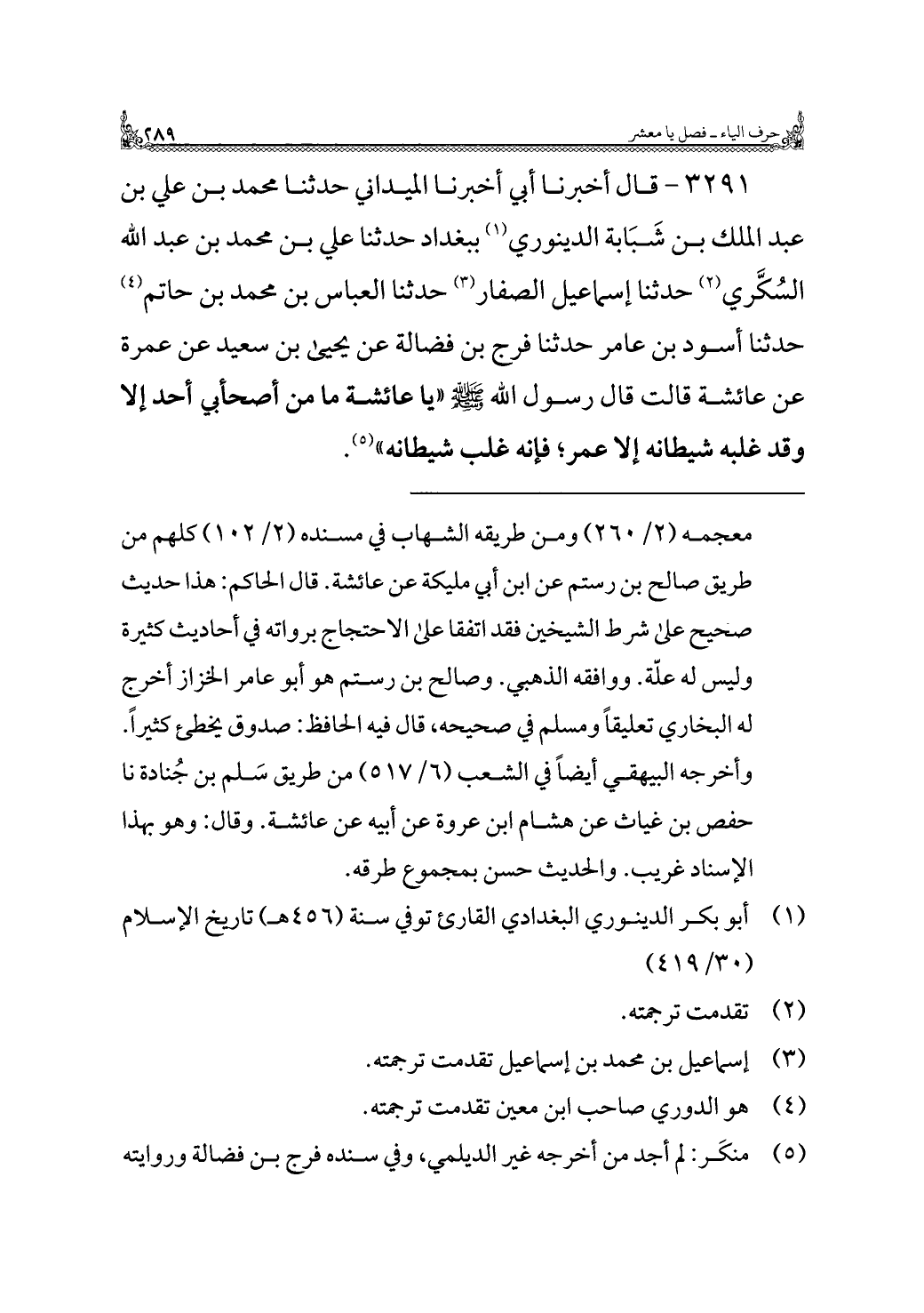 ٣٢٩١ - قال أخبرنا أبي أخبرنا الميداني حدثنا محمد بن علي بن عبد الملك بن شَبَابة الدينوري (¬١) ببغداد حدثنا علي بن محمد بن عبد اللَّه السُكَّري (¬٢) حدثنا إسماعيل الصفار (¬٣) حدثنا العباس بن محمد بن حاتم (¬٤) حدثنا أسود بن عامر حدثنا فرج بن فضالة عن يحيى بن سعيد عن عمرة عن عائشة قالت قال رسول اللَّه -صلى اللَّه عليه وسلم- "يا عائشة ما من أصحابي أحد إلا وقد غلبه شيطانه إلا عمر؛ فإنه غلب شيطانه" (¬٥).