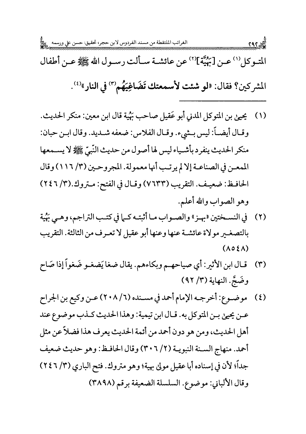 (¬٢) في النسختين "بهز" والصواب ما أثبته كما في كتب التراجم، وهي بَهُية بالتصغير مولاة عائشة عنها وعنها أبو عقيل لا تعرف من الثالثة. التقريب (٨٥٤٨).