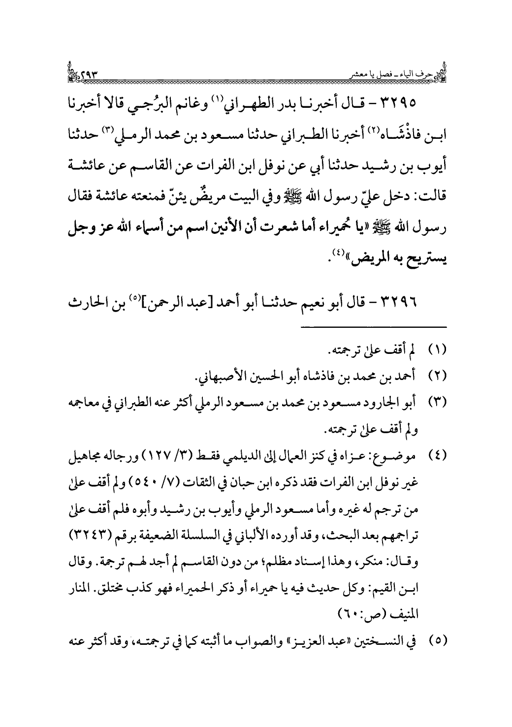 ٣٢٩٥ - قال أخبرنا بدر الطهراني (¬١) وغانم البرُجي قالا أخبرنا ابن فاذْشَاه (¬٢) أخبرنا الطبراني حدثنا مسعود بن محمد الرملي (¬٣) حدثنا أيوب بن رشيد حدثنا أبي عن نوفل ابن الفرات عن القاسم عن عائشة قالت: دخل عليّ رسول اللَّه -صلى اللَّه عليه وسلم- وفي البيت مريضٌ يئنّ فمنعته عائشة فقال رسول اللَّه -صلى اللَّه عليه وسلم- "يا حُميراء أما شعرت أن الأنين اسم من أسماء اللَّه عز وجل يستريح به المريض" (¬٤).
