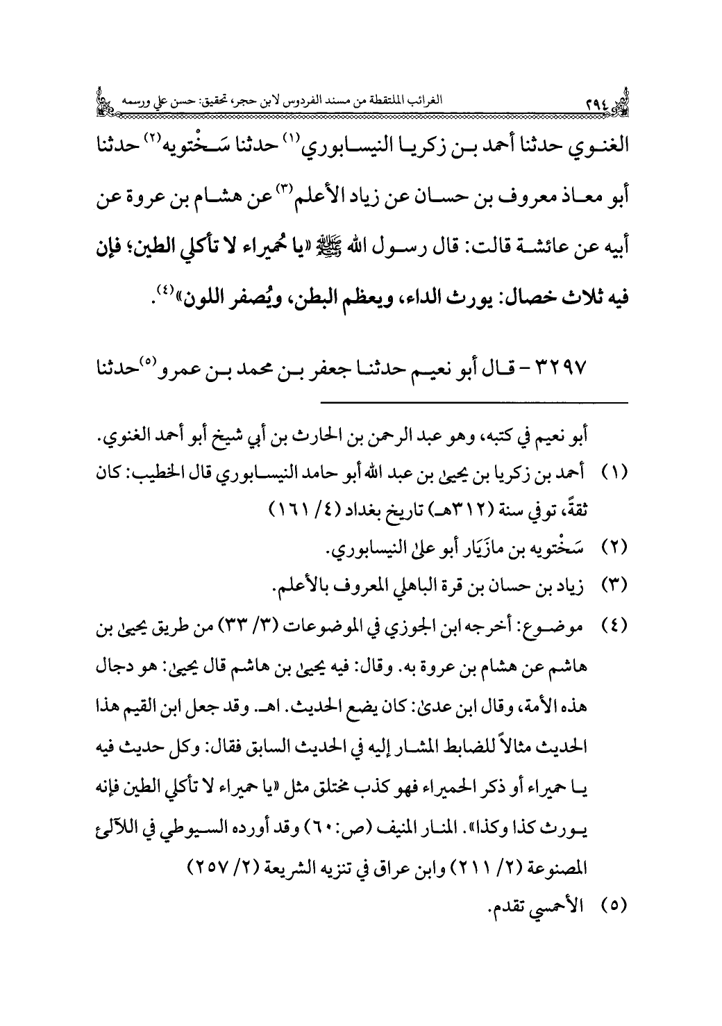 الغنوي حدثنا أحمد بن زكريا النيسابوري (¬١) حدثنا سَخْتويه (¬٢) حدثنا أبو معاذ معروف بن حسان عن زياد الأعلم (¬٣) عن هشام بن عروة عن أبيه عن عائشة قالت: قال رسول اللَّه -صلى اللَّه عليه وسلم- "يا حُميراء لا تأكلي الطين؛ فإن فيه ثلاث خصال: يورث الداء، ويعظم البطن، ويُصفر اللون" (¬٤).