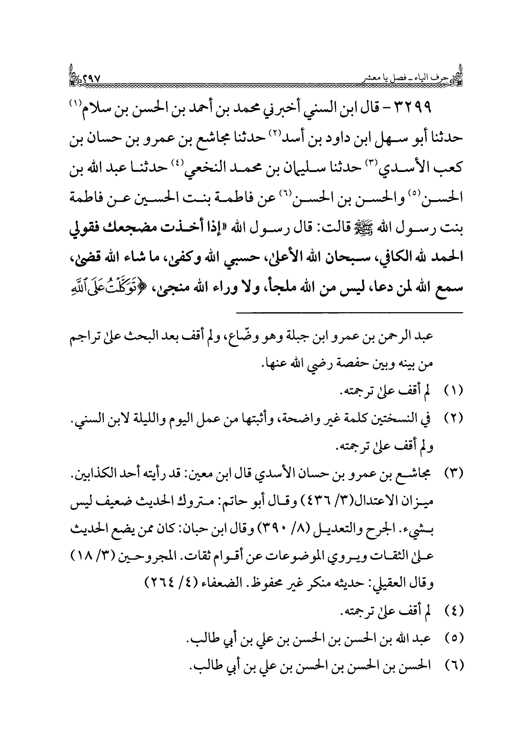 ٣٢٩٩ - قال ابن السني أخبرني محمد بن أحمد بن الحسن بن سلام (¬١) حدثنا أبو سهل ابن داود بن أسد (¬٢) حدثنا مجاشع بن عمرو بن حسان بن كعب الأسدي (¬٣) حدثنا سليمان بن محمد النخعي (¬٤) حدثنا عبد اللَّه بن الحسن (¬٥) والحسن بن الحسن (¬٦) عن فاطمة بنت الحسين عن فاطمة بنت رسول اللَّه -صلى اللَّه عليه وسلم- قالت: قال رسول اللَّه "إذا أخذت مضجعك فقولي الحمد للَّه الكافي، سبحان اللَّه الأعلى، حسبي اللَّه وكفى، ما شاء اللَّه قضى، سمع اللَّه لمن دعا، ليس من اللَّه ملجأ، ولا وراء اللَّه منجى، {تَوَكَّلْتُ عَلَى اللَّهِ