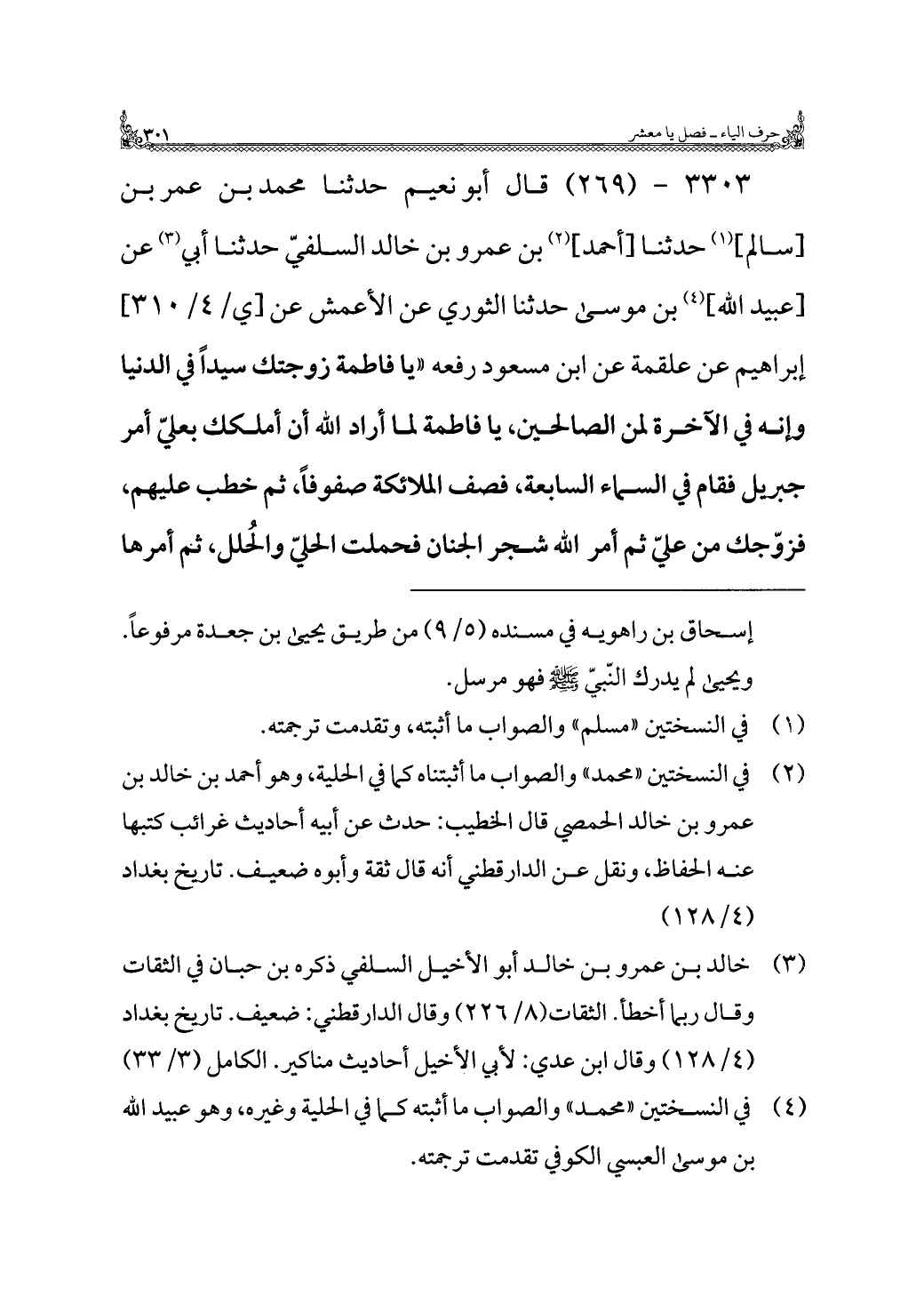 ٣٣٠٣ - (٢٦٩) قال أبو نعيم حدثنا محمد بن عمر بن [سالم] (¬١) حدثنا [أحمد] (¬٢) بن عمرو بن خالد السلفيّ حدثنا أبي (¬٣) عن [عبيد اللَّه] (¬٤) بن موسى حدثنا الثوري عن الأعمش عن إبراهيم عن علقمة عن ابن مسعود رفعه "يا فاطمة زوجتك سيدًا في الدنيا وإنه في الآخرة لمن الصالحين، يا فاطمة لما أراد اللَّه أن أملكك بعليّ أمر جبريل فقام في السماء السابعة، فصف الملائكة صفوفًا، ثم خطب عليهم، فزوّجك من عليّ ثم أمر اللَّه شجر الجنان فحملت الحليّ والحُلل، ثم أمرها
