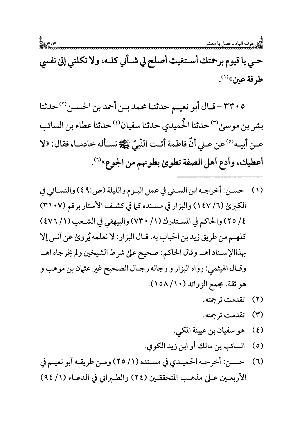 ٣٣٠٥ - قال أبو نعيم حدثنا محمد بن أحمد بن الحسن (¬٢) حدثنا بشر بن موسى (¬٣) حدثنا الحُميدي حدثنا سفيان (¬٤) حدثنا عطاء بن السائب عن أبيه (¬٥) عن علي أنّ فاطمة أتت النّبيّ -صلى اللَّه عليه وسلم- تسأله خادما، فقال: "لا أعطيك، وأدع أهل الصفة تطوى بطونهم من الجوع" (¬٦).