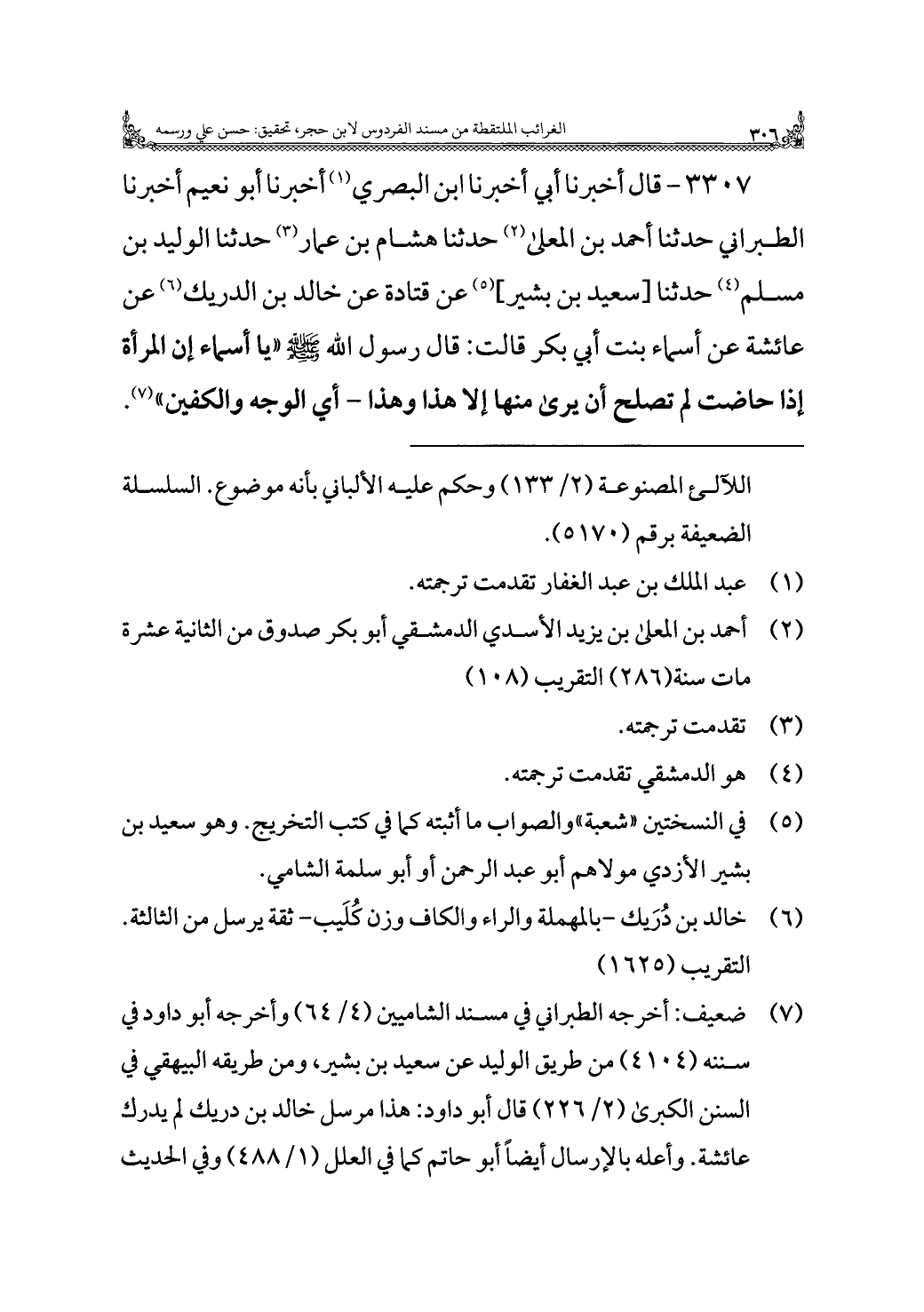 ٣٣٠٧ - قال أخبرنا أبي أخبرنا ابن البصري (¬١) أخبرنا أبو نعيم أخبرنا الطبراني حدثنا أحمد بن المعلى (¬٢) حدثنا هشام بن عمار (¬٣) حدثنا الوليد بن مسلم (¬٤) حدثنا [سعيد بن بشير] (¬٥) عن قتادة عن خالد بن الدريك (¬٦) عن عائشة عن أسماء بنت أبي بكر قالت: قال رسول اللَّه -صلى اللَّه عليه وسلم- "يا أسماء إن المرأة إذا حاضت لم تصلح أن يرى منها إلا هذا وهذا - أي الوجه والكفين" (¬٧).