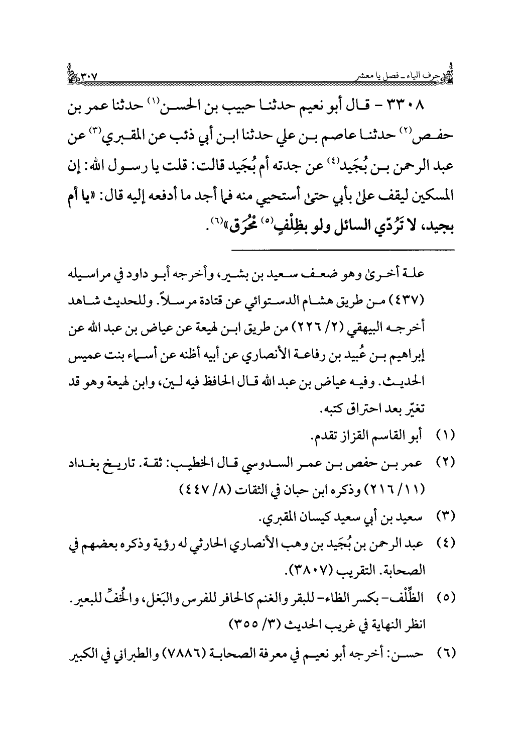 ٣٣٠٨ - قال أبو نعيم حدثنا حبيب بن الحسن (¬١) حدثنا عمر بن حفص (¬٢) حدثنا عاصم بن علي حدثنا ابن أبي ذئب عن المقبري (¬٣) عن عبد الرحمن بن بُجَيد (¬٤) عن جدته أم بُجَيد قالت: قلت يا رسول اللَّه: إن المسكين ليقف على بأبي حتى أستحيي منه فما أجد ما أدفعه إليه قال: "يا أم بجيد، لا تَرُدّي السائل ولو بظِلْفٍ (¬٥) مُحْرَق" (¬٦).