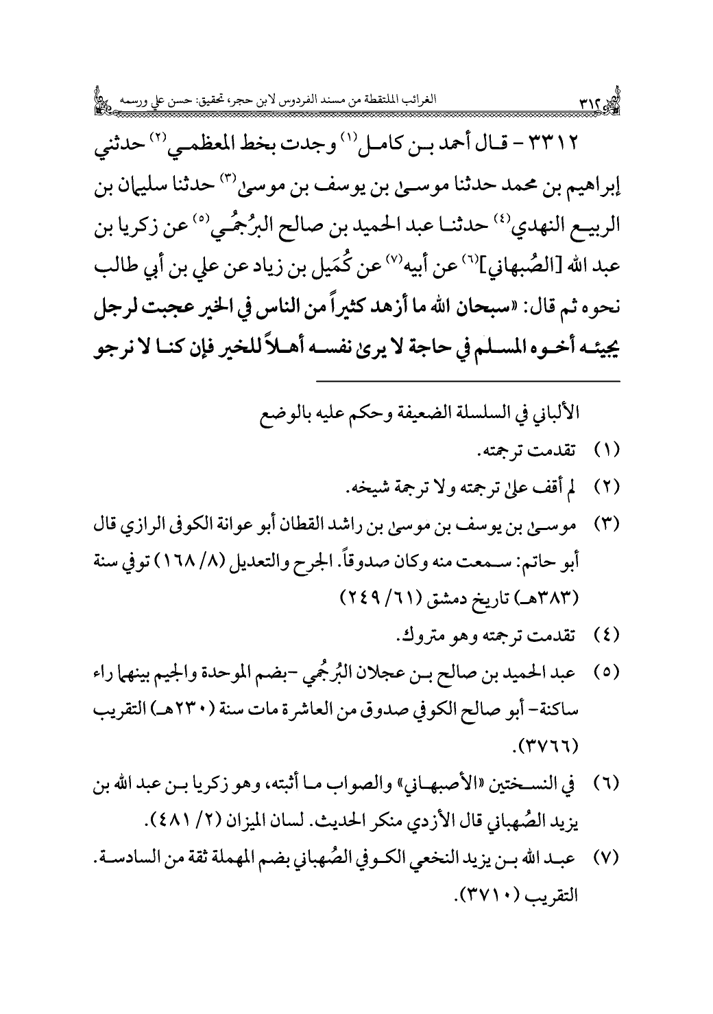 ٣٣١٢ - قال أحمد بن كامل (¬١) وجدت بخط المعظمي (¬٢) حدثني إبراهيم بن محمد حدثنا موسى بن يوسف بن موسى (¬٣) حدثنا سليمان بن الربيع النهدي (¬٤) حدثنا عبد الحميد بن صالح البُرجُمي (¬٥) عن زكريا بن عبد اللَّه [الصُبهاني] (¬٦) عن أبيه (¬٧) عن كُمَيل بن زياد عن علي بن أبي طالب نحوه ثم قال: "سبحان اللَّه ما أزهد كثيرًا من الناس في الخير عجبت لرجل يجيئه أخوه المسلم في حاجة لا يرى نفسه أهلًا للخير فإن كنا لا نرجو