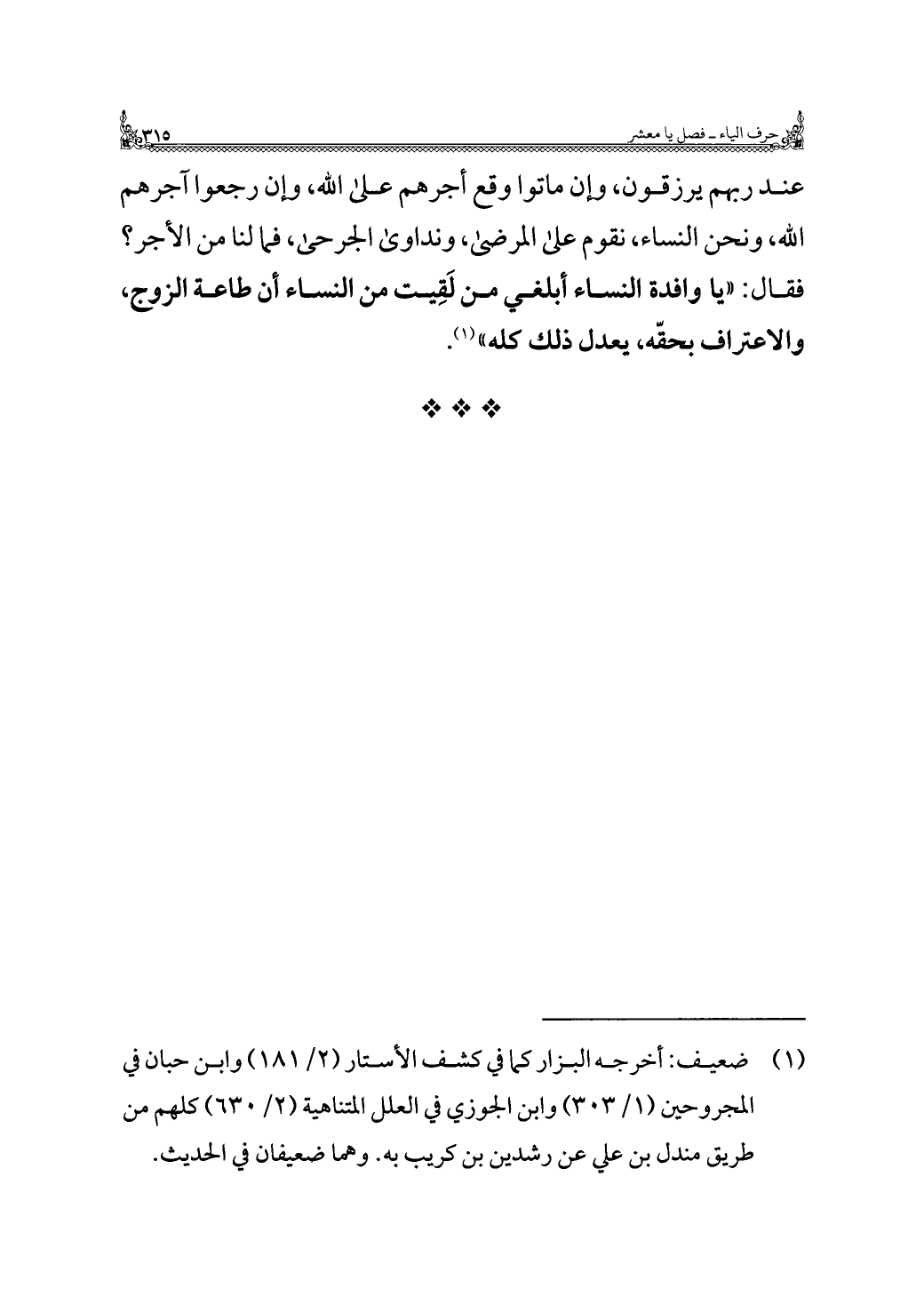 عند ربهم يرزقون، وإن ماتوا وقع أجرهم على اللَّه، وإن رجعوا آجرهم اللَّه، ونحن النساء، نقوم على المرضى، ونداوي الجرحى، فما لنا من الأجر؟ فقال: "يا وافدة النساء أبلغي من لَقِيت من النساء أن طاعة الزوج، والاعتراف بحقّه، يعدل ذلك كله" (¬١).