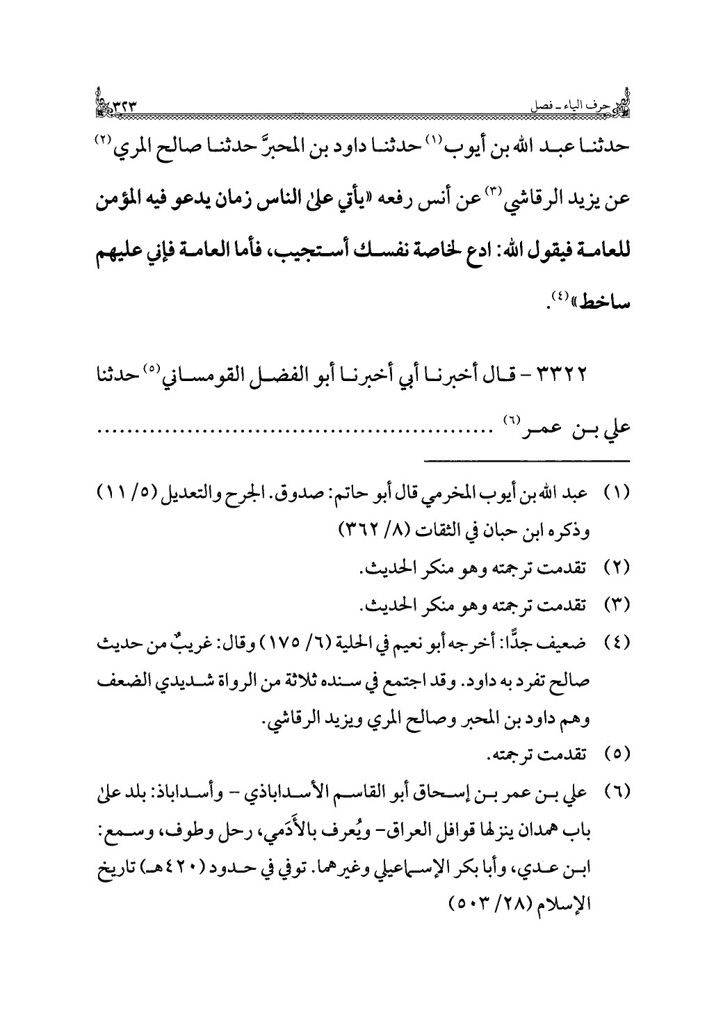 ٣٣٢٢ - قال أخبرنا أبي أخبرنا أبو الفضل القومساني (¬٥) حدثنا علي بن عمر (¬٦). . . . . . . .