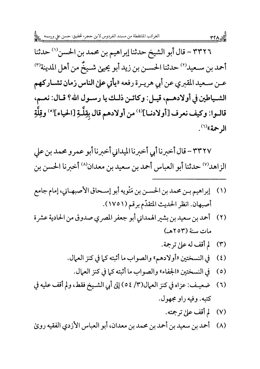 ٣٣٢٦ - قال أبو الشيخ حدثنا إبراهيم بن محمد بن الحسن (¬١) حدثنا أحمد بن سعيد (¬٢) حدثنا الحسن بن زيد أبو يحيى شيخٌ من أهل المدينة (¬٣) عن سعيد المقبري عن أبي هريرة رفعه "يأتي على الناس زمان تشاركهم الشياطين في أولادهم، قيل: وكلائن ذلك يا رسول اللَّه؟ قال: نعم، قالوا: وكيف نعرف [أولادنا] (¬٤) من أولادهم قال بِقِلَّةِ [الحياء] (¬٥) وقِلَّةِ الرحمة" (¬٦).