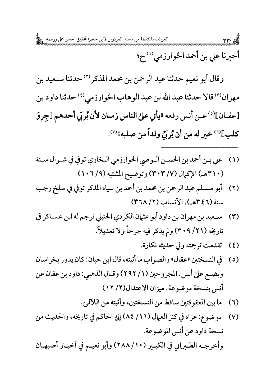 وقال أبو نعيم حدثنا عبد الرحمن بن محمد المذكر (¬٢) حدثنا سعيد بن مهران (¬٣) قالا حدثنا عبد اللَّه بن عبد الوهاب الخوارزمي (¬٤) حدثنا داود بن [عفان] (¬٥) عن أنس رفعه "يأتي على الناس زمان لأن يُربيّ أحدهم [جِروَ كلب] (¬٦) خير له من أن يُربَيِّ ولدًا من صلبه" (¬٧).