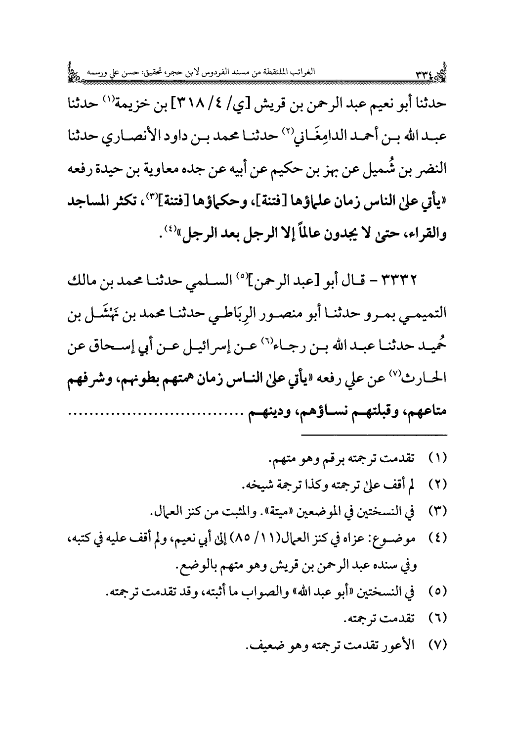حدثنا أبو نعيم عبد الرحمن بن قريش بن خزيمة (¬١) حدثنا عبد اللَّه بن أحمد الدامِغَاني (¬٢) حدثنا محمد بن داود الأنصاري حدثنا النضر بن شُميل عن بهز بن حكيم عن أبيه عن جده معاوية بن حيدة رفعه "يأتي على الناس زمان علماؤها [فتنة]، وحكماؤها [فتنة] (¬٣)، تكثر المساجد والقراء، حتى لا يجدون عالمًا إلا الرجل بعد الرجل" (¬٤).