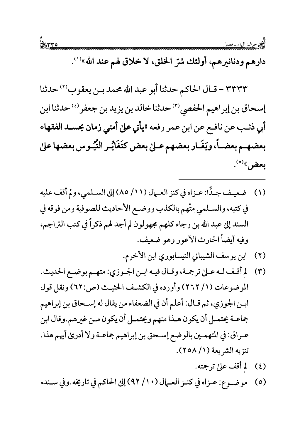 ٣٣٣٣ - قال الحاكم حدثنا أبو عبد اللَّه محمد بن يعقوب (¬٢) حدثنا إسحاق بن إبراهيم الحفصي (¬٣) حدثنا خالد بن يزيد بن جعفر (¬٤) حدثنا ابن أبي ذئب عن نافع عن ابن عمر رفعه "يأتي على أمتي زمان يحسد الفقهاء بعضهم بعضًا، ويَغَار بعضهم على بعض كتَغَايُر التُيُوس بعضها على بعض" (¬٥).