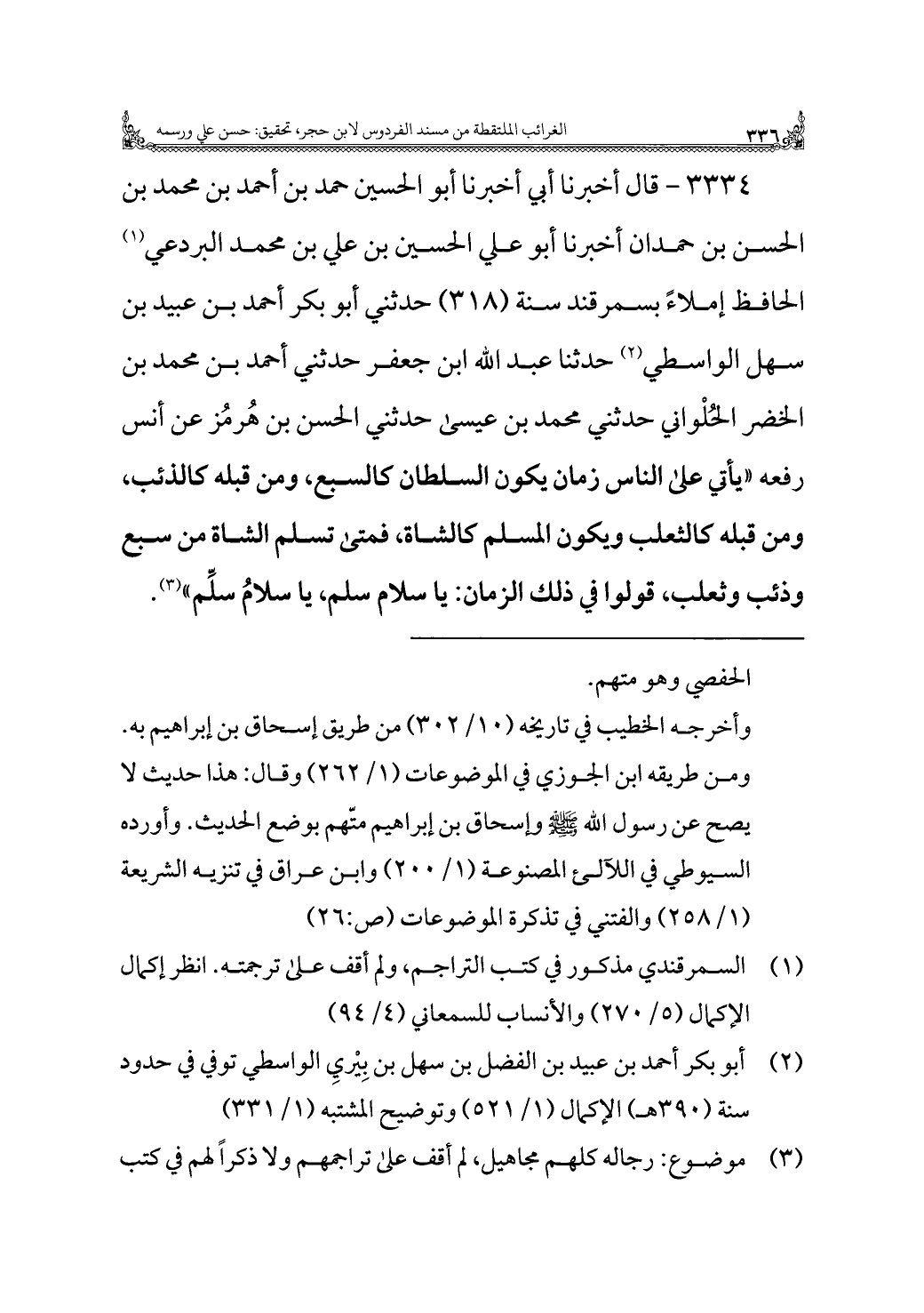 ٣٣٣٤ - قال أخبرنا أبي أخبرنا أبو الحسين محمد بن أحمد بن محمد بن الحسن بن حمدان أخبرنا أبو علي الحسين بن علي بن محمد البردعي (¬١) الحافظ إملاءً بسمرقند سنة (٣١٨) حدثني أبو بكر أحمد بن عبيد بن سهل الواسطي (¬٢) حدثنا عبد اللَّه ابن جعفر حدثني أحمد بن محمد بن الخضر الحُلْواني حدثني محمد بن عيسى حدثني الحسن بن هُرمُز عن أنس رفعه "يأتي على الناس زمان يكون السلطان كالسبع، ومن قبله كالذئب، ومن قبله كالثعلب ويكون المسلم كالشاة، فمتى تسلم الشاة من سبع وذئب وثعلب، قولوا في ذلك الزمان: يا سلام سلم، يا سلامُ سلِّم" (¬٣).