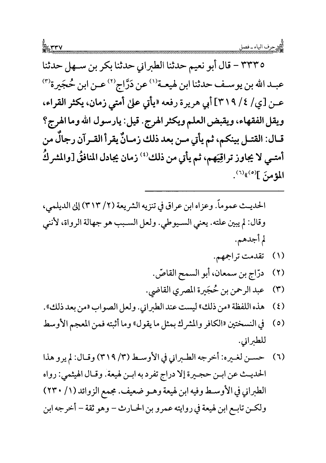 ٣٣٣٥ - قال أبو نعيم حدثنا الطبراني حدثنا بكر بن سهل حدثنا عبد اللَّه بن يوسف حدثنا ابن لهيعة (¬١) عن دَرَّاج (¬٢) عن ابن حُجَيرة (¬٣) عن أبي هريرة رفعه "يأتي على أمتي زمان، يكثر القراء، ويقل الفقهاء، ويقبض العلم ويكثر الهرج. قيل: يارسول اللَّه وما الهرج؟ قال: القتل بينكم، ثم يأتي من بعد ذلك زمانٌ يقرأ القرآن رجالٌ من أمتي لا يجاوز تراقِيَهم، ثم يأتي من ذلك (¬٤) زمان يجادل المنافقُ [والمشركُ المؤمنَ] (¬٥) " (¬٦).
