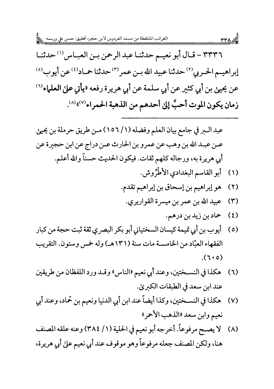 ٣٣٣٦ - قال أبو نعيم حدثنا عبد الرحمن بن العباس (¬١) حدثنا إبراهيم الحربي (¬٢) حدثنا عبيد اللَّه بن عمر (¬٣) حدثنا حماد (¬٤) عن أيوب (¬٥) عن يحيى بن أبي كثير عن أبي سلمة عن أبي هريرة رفعه "يأتي على العلماء (¬٦) زمان يكون الموت أحبَّ إلى أحدهم من الذهبة الحمراء (¬٧) " (¬٨).