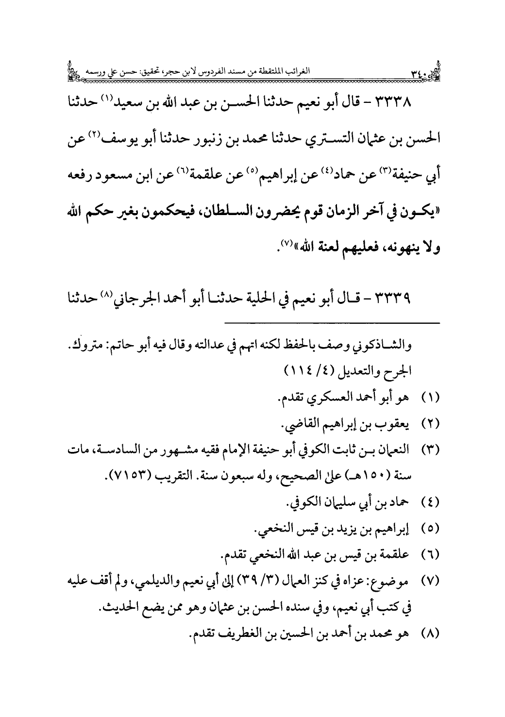 ٣٣٣٨ - قال أبو نعيم حدثنا الحسن بن عبد اللَّه بن سعيد (¬١) حدثنا الحسن بن عثمان التستري حدثنا محمد بن زنبور حدثنا أبو يوسف (¬٢) عن أبي حنيفة (¬٣) عن حماد (¬٤) عن إبراهيم (¬٥) عن علقمة (¬٦) عن ابن مسعود رفعه "يكون في آخر الزمان قوم يحضرون السلطان، فيحكمون بغير حكم اللَّه ولا ينهونه، فعليهم لعنة اللَّه" (¬٧).