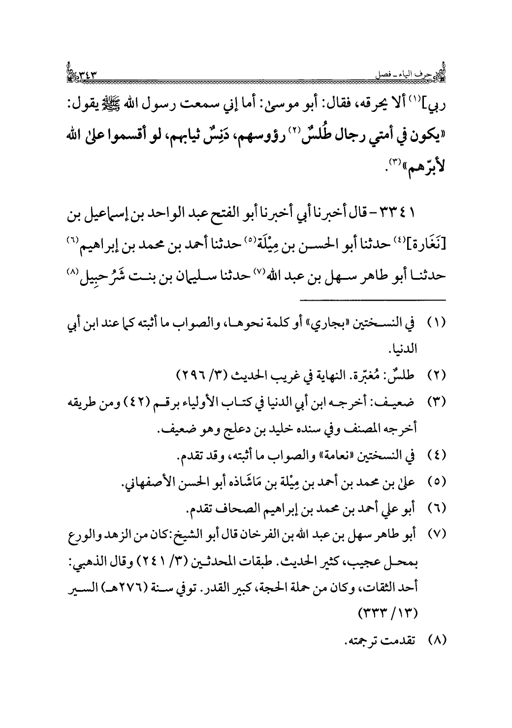 ٣٣٤١ - قال أخبرنا أبي أخبرنا أبو الفتح عبد الواحد بن إسماعيل بن [نَغَارة] (¬٤) حدثنا أبو الحسن بن مِيْلَة (¬٥) حدثنا أحمد بن محمد بن إبراهيم (¬٦) حدثنا أبو طاهر سهل بن عبد اللَّه (¬٧) حدثنا سليمان بن بنت شَرُحبِيل (¬٨)