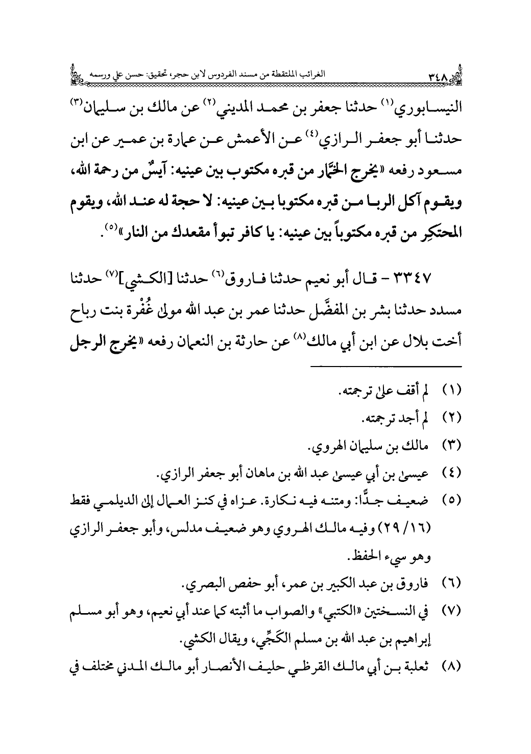 ٣٣٤٧ - قال أبو نعيم حدثنا فاروق (¬٦) حدثنا [الكشي] (¬٧) حدثنا مسدد حدثنا بشر بن المفضَّل حدثنا عمر بن عبد اللَّه مولى غُفْرة بنت رباح أخت بلال عن ابن أبي مالك (¬٨) عن حارثة بن النعمان رفعه "يخرج الرجل