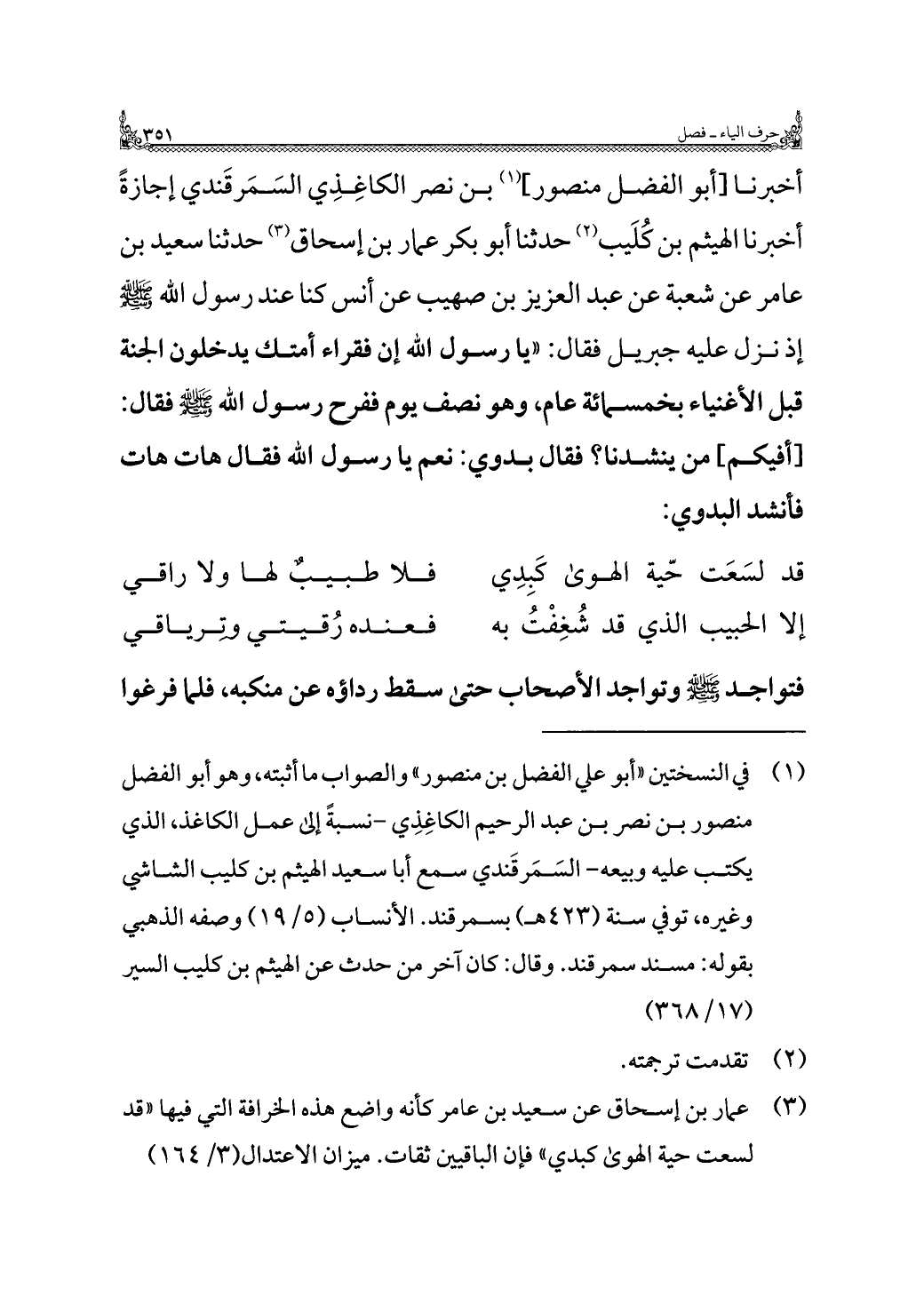 أخبرنا [أبو الفضل منصور] (¬١) بن نصر الكاغِذِي السَمَرقَندي إجازةً أخبرنا الهيثم بن كُلَيب (¬٢) حدثنا أبو بكر عمار بن إسحاق (¬٣) حدثنا سعيد بن عامر عن شعبة عن عبد العزيز بن صهيب عن أنس كنا عند رسول اللَّه -صلى اللَّه عليه وسلم- إذ نزل عليه جبريل فقال: "يا رسول اللَّه إن فقراء أمتك يدخلون الجنة قبل الأغنياء بخمسمائة عام، وهو نصف يوم ففرح رسول اللَّه -صلى اللَّه عليه وسلم- فقال: [أفيكم] من ينشدنا؟ فقال بدوي: نعم يا رسول اللَّه فقال هات هات فأنشد البدوي:
