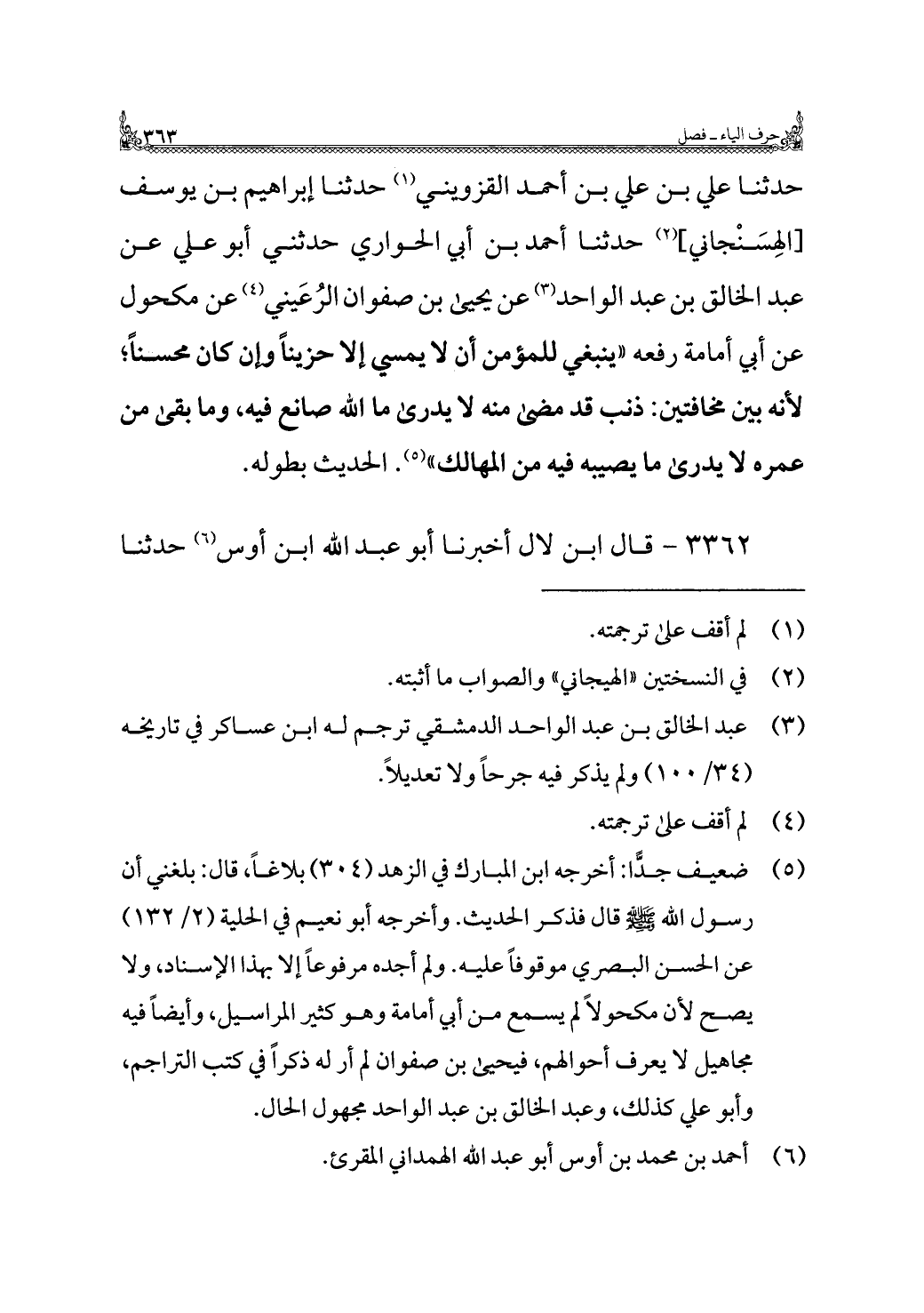 ٣٣٥٧ - قال وأخبرنا أبو طاهر الحسنَابَاذِي (¬٤) أخبرنا أبو بكر البَاطِرْقَاني (¬٥) حدثنا ابن منده (¬٦) حدثنا أحمد بن محمد بن شعيب (¬٧) حدثنا سهل بن [عمّار] (¬٨) حدثنا حفص بن عبد اللَّه السلمي حدثنا عبد القدوس (¬٩) عن حماد بن أبي سليمان عن زياد بن ميمون عن أنس، به (¬١٠).