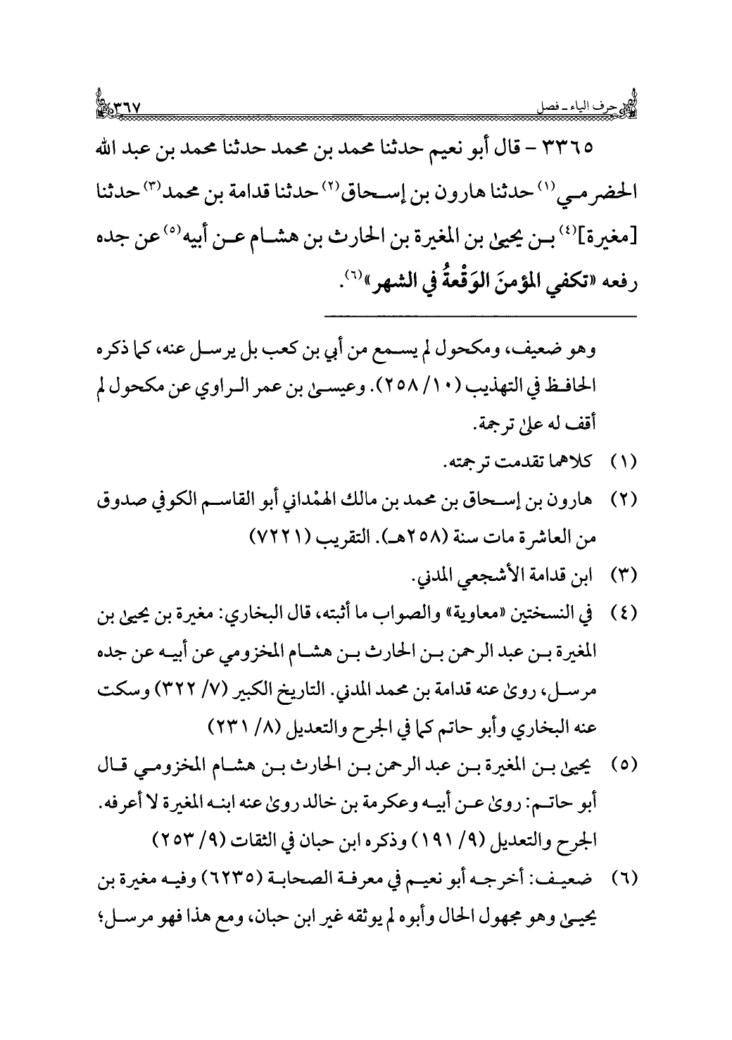 ٣٣٦٥ - قال أبو نعيم حدثنا محمد بن محمد حدثنا محمد بن عبد اللَّه الحضرمي (¬١) حدثنا هارون بن إسحاق (¬٢) حدثنا قدامة بن محمد (¬٣) حدثنا [مغيرة] (¬٤) بن يحيى بن المغيرة بن الحارث بن هشام عن أبيه (¬٥) عن جده رفعه "تكفي المؤمنَ الوَقْعةُ في الشهر" (¬٦).