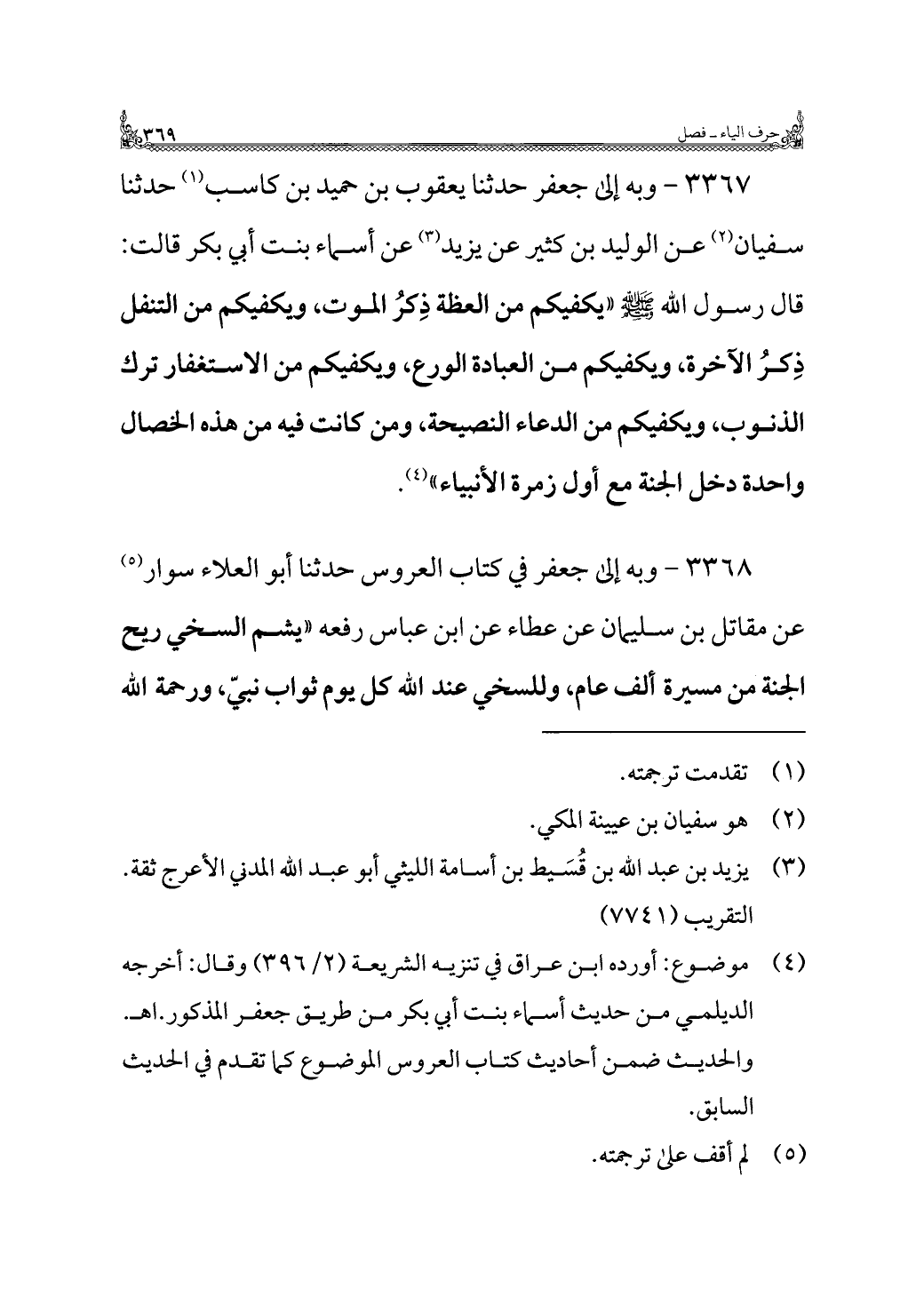 ٣٣٦٧ - وبه إلى جعفر حدثنا يعقوب بن حميد بن كاسب (¬١) حدثنا سفيان (¬٢) عن الوليد بن كثير عن يزيد (¬٣) عن أسماء بنت أبي بكر قالت: قال رسول اللَّه -صلى اللَّه عليه وسلم- "يكفيكم من العظة ذِكرُ الموت، ويكفيكم من التنفل ذِكرُ الآخرة، ويكفيكم من العبادة الورع، ويكفيكم من الاستغفار ترك الذنوب، ويكفيكم من الدعاء النصيحة، ومن كانت فيه من هذه الخصال واحدة دخل الجنة مع أول زمرة الأنبياء" (¬٤).