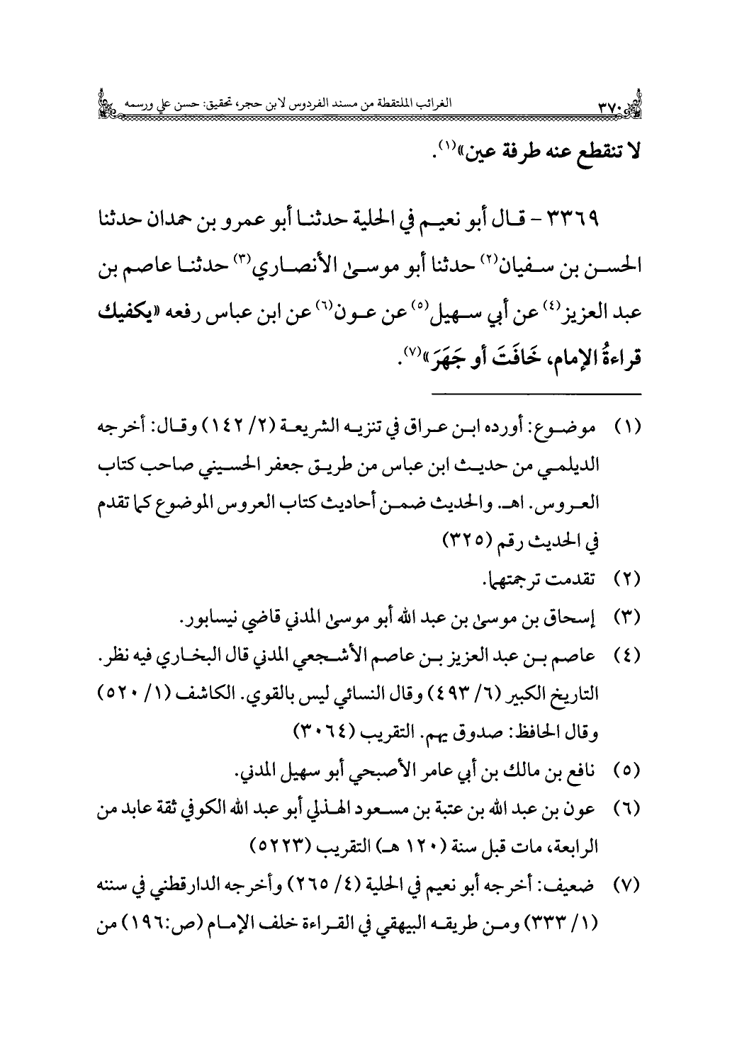 ٣٣٦٩ - قال أبو نعيم في الحلية حدثنا أبو عمرو بن حمدان حدثنا الحسن بن سفيان (¬٢) حدثنا أبو موسى الأنصاري (¬٣) حدثنا عاصم بن عبد العزيز (¬٤) عن أبي سهيل (¬٥) عن عون (¬٦) عن ابن عباس رفعه "يكفيك قراءةُ الإمام، خَافَتَ أو جَهَرَ" (¬٧).