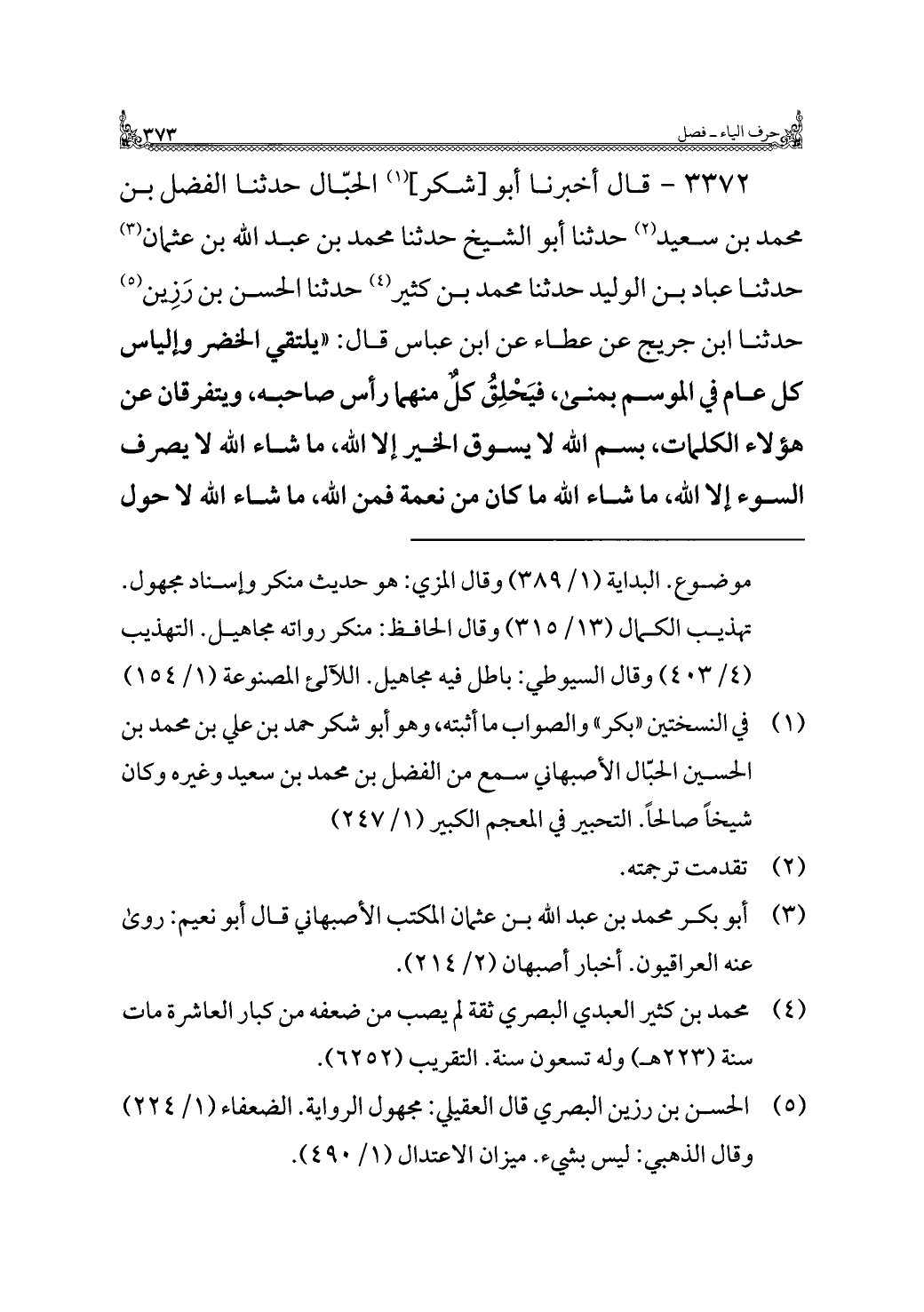 ٣٣٧٢ - قال أخبرنا أبو [شكر] (¬١) الحبّال حدثنا الفضل بن محمد بن سعيد (¬٢) حدثنا أبو الشيخ حدثنا محمد بن عبد اللَّه بن عثمان (¬٣) حدثنا عباد بن الوليد حدثنا محمد بن كثير (¬٤) حدثنا الحسن بن رَزِين (¬٥) حدثنا ابن جريج عن عطاء عن ابن عباس قال: "يلتقي الخضر وإلياس كل عام في الموسم بمنى، فيَحْلِقُ كلٌ منهما رأس صاحبه، ويتفرقان عن هؤلاء الكلمات، بسم اللَّه لا يسوق الخير إلا اللَّه، ما شاء اللَّه لا يصرف السوء إلا اللَّه، ما شاء اللَّه ما كان من نعمة فمن اللَّه، ما شاء اللَّه لاحول