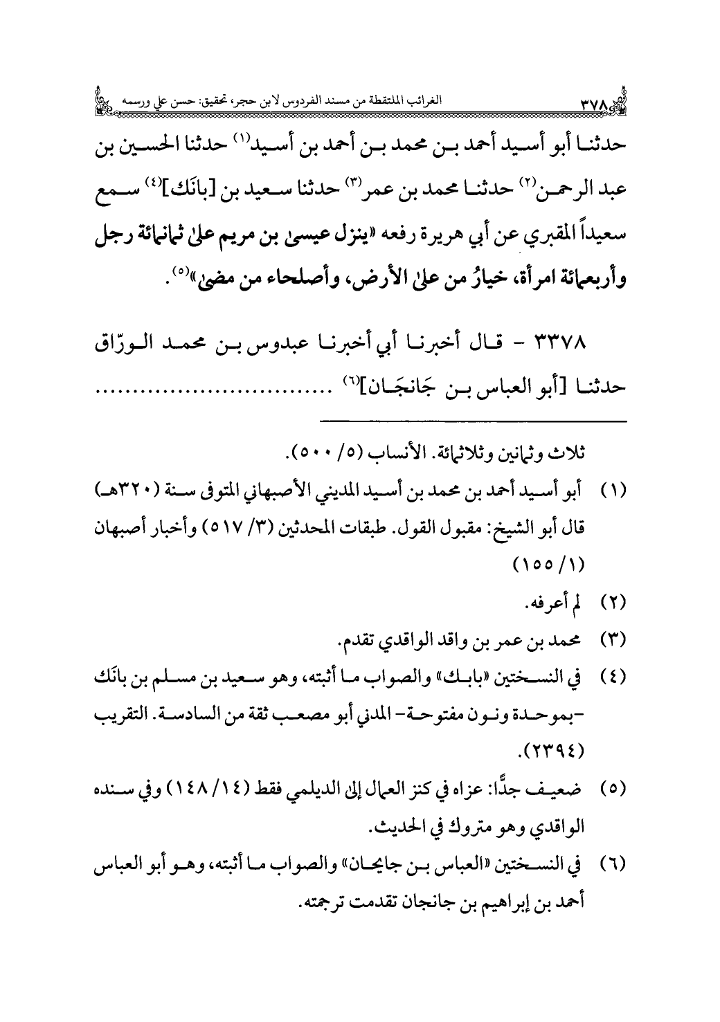حدثنا أبو أسيد أحمد بن محمد بن أحمد بن أسيد (¬١) حدثنا الحسين بن عبد الرحمن (¬٢) حدثنا محمد بن عمر (¬٣) حدثنا سعيد بن [بانَك] (¬٤) سمع سعيدًا المقبري عن أبي هريرة رفعه "ينزل عيسى بن مريم على ثمانمائة رجل وأربعمائة امرأة، خيارُ من على الأرض، وأصلحاء من مضى" (¬٥).