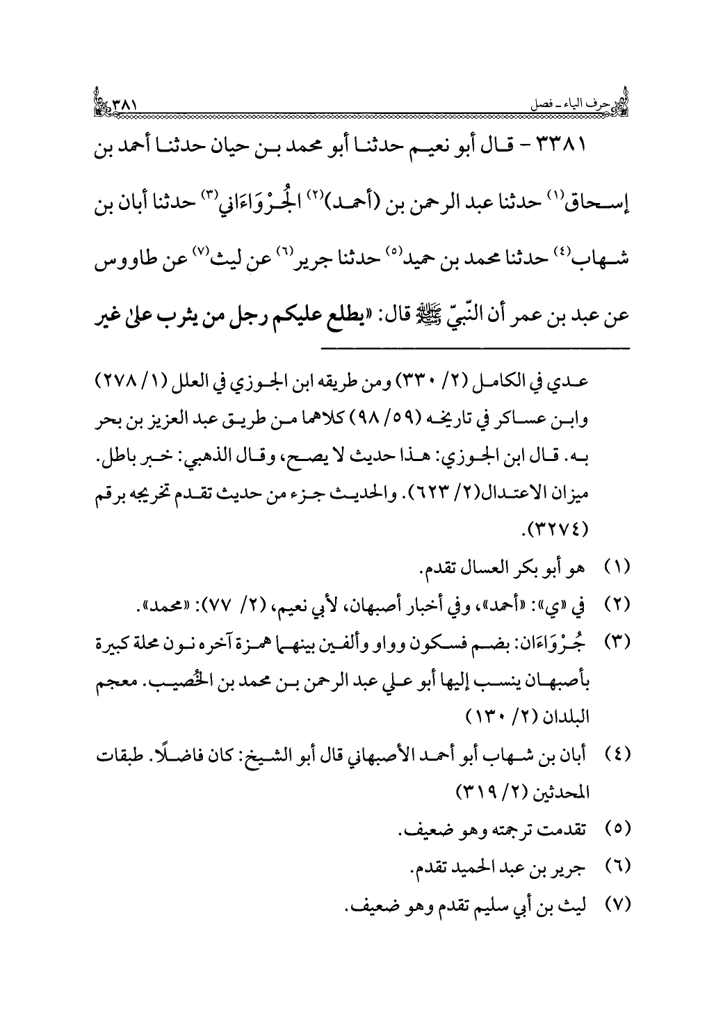 ٣٣٨١ - قال أبو نعيم حدثنا أبو محمد بن حيان حدثنا أحمد بن إسحاق (¬١) حدثنا عبد الرحمن بن (أحمد) (¬٢) الجُرْوَاءَاني (¬٣) حدثنا أبان بن شهاب (¬٤) حدثنا محمد بن حميد (¬٥) حدثنا جرير (¬٦) عن ليث (¬٧) عن طاووس عن عبد بن عمر أن النّبيّ -صلى اللَّه عليه وسلم- قال: "يطلع عليكم رجل من يثرب على غير