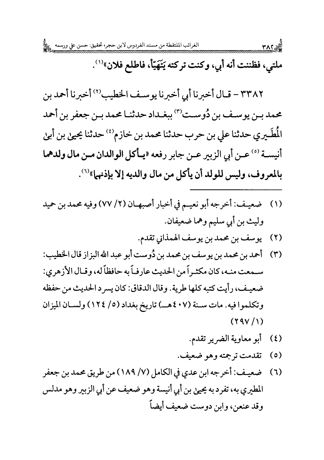 ٣٣٨٢ - قال أخبرنا أبي أخبرنا يوسف الخطيب (¬٢) أخبرنا أحمد بن محمد بن يوسف بن دُوست (¬٣) ببغداد حدثنا محمد بن جعفر بن أحمد المُطَيري حدثنا علي بن حرب حدثنا محمد بن خازم (¬٤) حدثنا يحيى بن أبي أنيسة (¬٥) عن أبي الزبير عن جابر رفعه "يأكل الوالدان من مال ولدهما بالمعروف، وليس للولد أن يكل من مال والديه إلا بإذنهما" (¬٦).