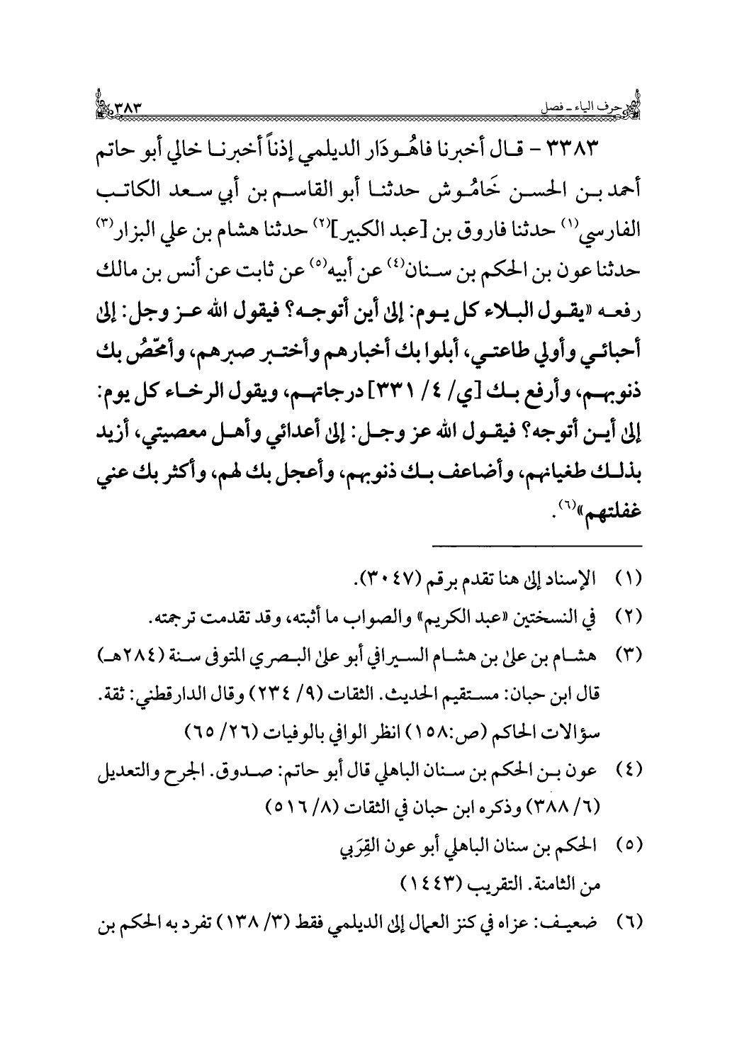 ٣٣٨٣ - قال أخبرنا فاهُودَار الديلمي إذنًا أخبرنا خالي أبو حاتم أحمد بن الحسن خَامُوش حدثنا أبو القاسم بن أبي سعد الكاتب الفارسي (¬١) حدثنا فاروق بن [عبد الكبير] (¬٢) حدثنا هشام بن علي البزار (¬٣) حدثنا عون بن الحكم بن سنان (¬٤) عن أبيه (¬٥) عن ثابت عن أنس بن مالك رفعه "يقول البلاء كل يوم: إلى أين أتوجه؟ فيقول اللَّه عز وجل: إلى أحبائي وأولي طاعتي، أبلوا بك أخبارهم وأختبر صبرهم، وأمحّصُ بك ذنوبهم، وأرفع بك درجاتهم، ويقول الرخاء كل يوم: إلى أين أتوجه؟ فيقول اللَّه عز وجل: إلى أعدائي وأهل معصيتي، أزيد بذلك طغيانهم، وأضاعف بك ذنوبهم، وأعجل بك لهم، وأكثر بك عني غفلتهم" (¬٦).