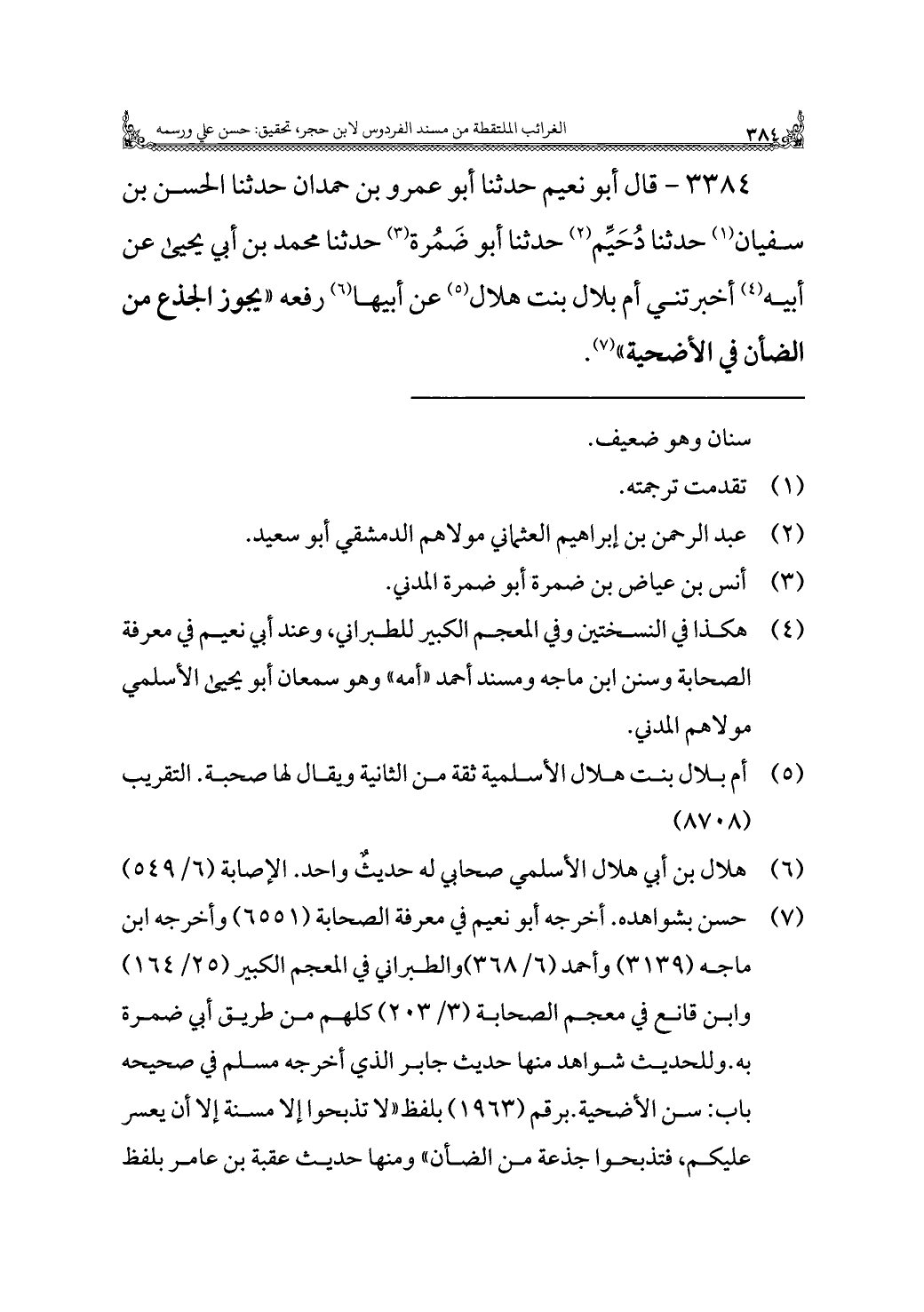 ٣٣٨٤ - قال أبو نعيم حدثنا أبو عمرو بن حمدان حدثنا الحسن بن سفيان (¬١) حدثنا دُحَيِّم (¬٢) حدثنا أبو ضَمُرة (¬٣) حدثنا محمد بن أبي يحيى عن أبيه (¬٤) أخبرتني أم بلال بنت هلال (¬٥) عن أبيها (¬٦) رفعه "يجوز الجذع من الضأن في الأضحية" (¬٧).